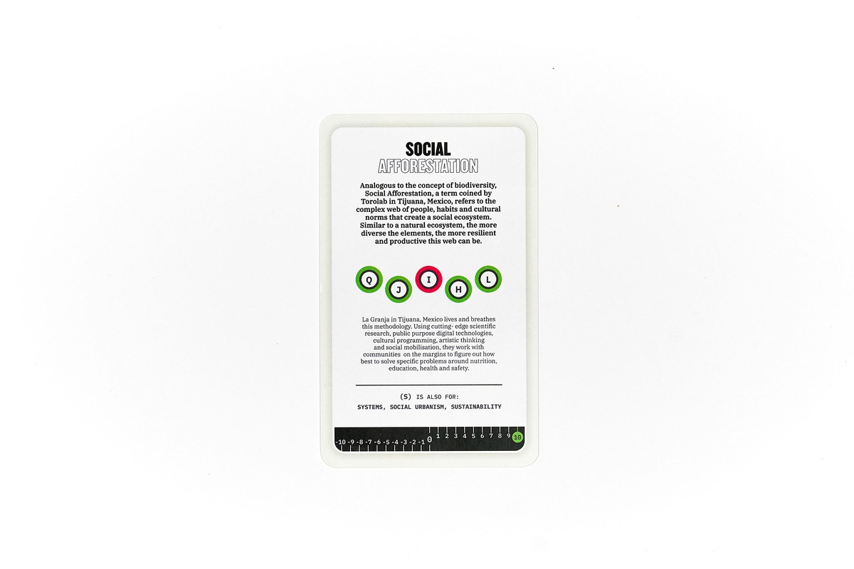 Still carrying the remnants of the Biodiversity cards, (S) for Social Afforestation draws an interesting analogy between forests and human networks. A forest is dependant on the richness of the soil, the suitability of the climate, and gestalt of what lives inside of it.Naturally connected to this card, is (L) for Livability.