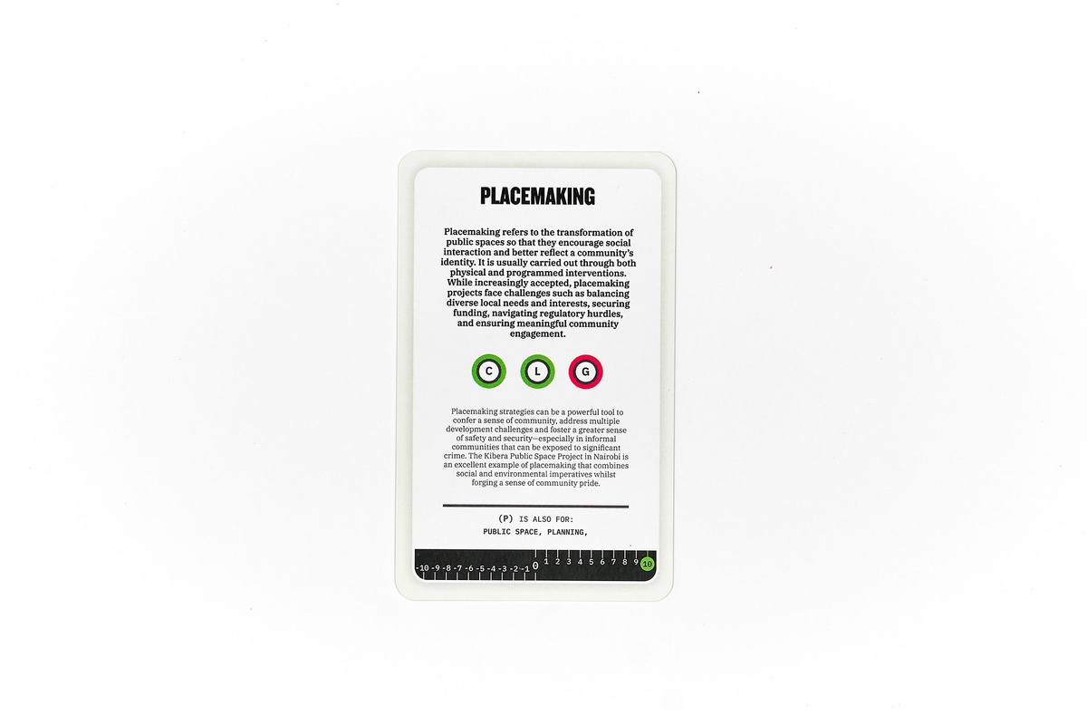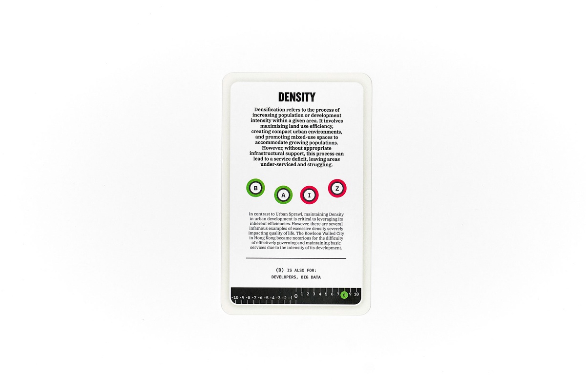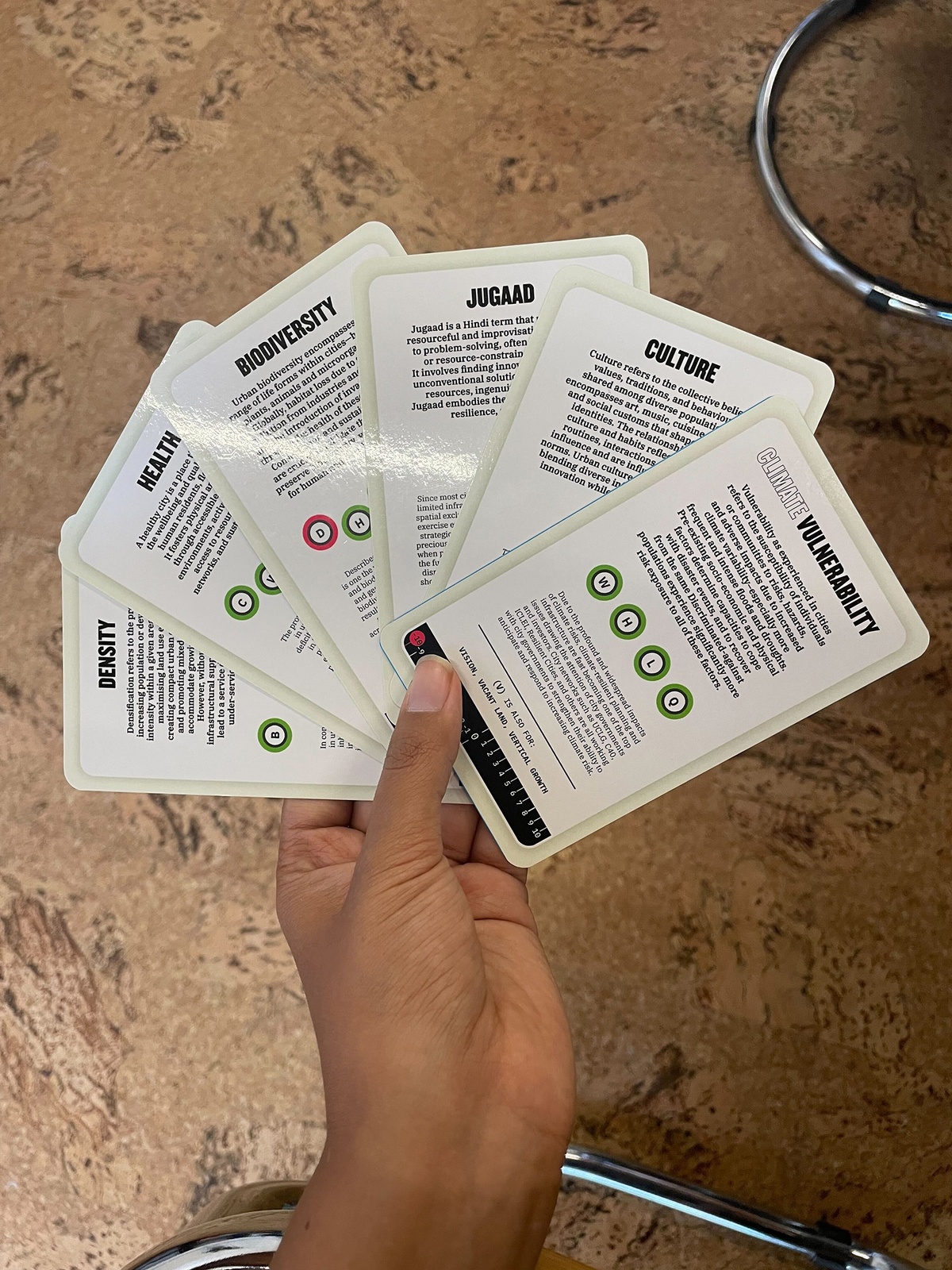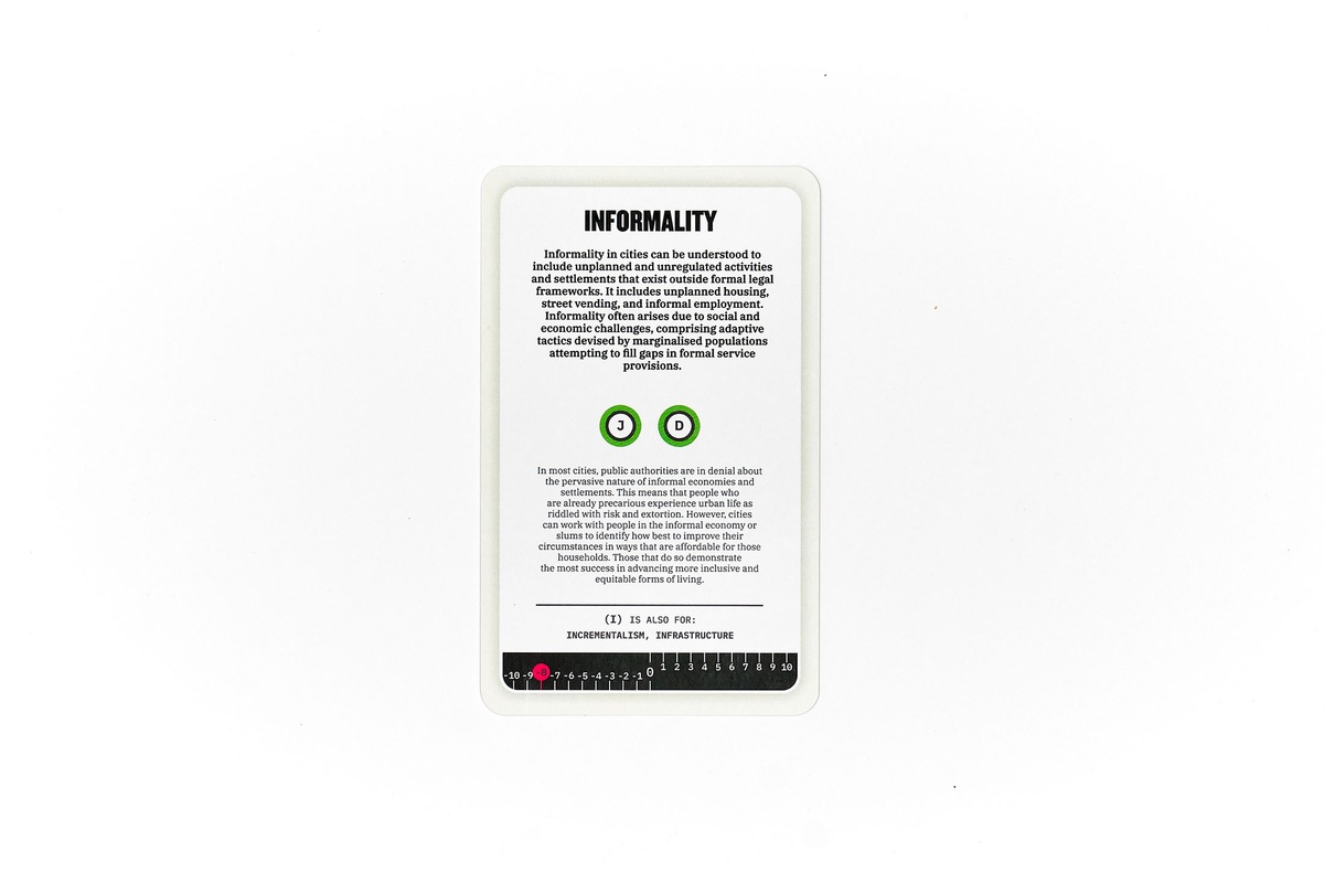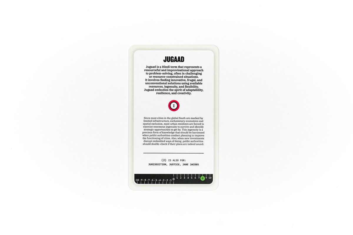 In the Urban Canvas Deck, the (J) for Jugaad card displays the letter (I) on it, signalling that it is connected to another card, (I) for Informality. Each card is designed around specific urban topics, but also creates a network of terms that allows the player to see these elements as puzzle pieces or coordinates rather than standalone definitions.