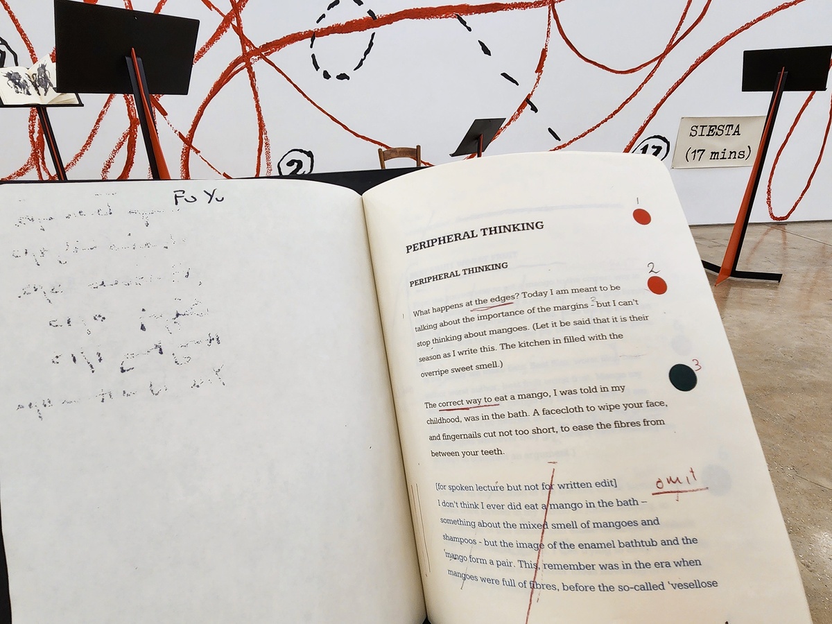 From 30, I find it most useful to read Notebook 4, which is close-by to the left.This is a lecture on peripheral thinking: the ideas that pull us out of focus and into the margins of our mind. Kentridge writes, “Today I am meant to be talking about the importance of the margins – but I can't stop thinking about mangoes. (Let it be said that it is their season as I write this. The kitchen [is] filled with the overripe sweet smell.)”