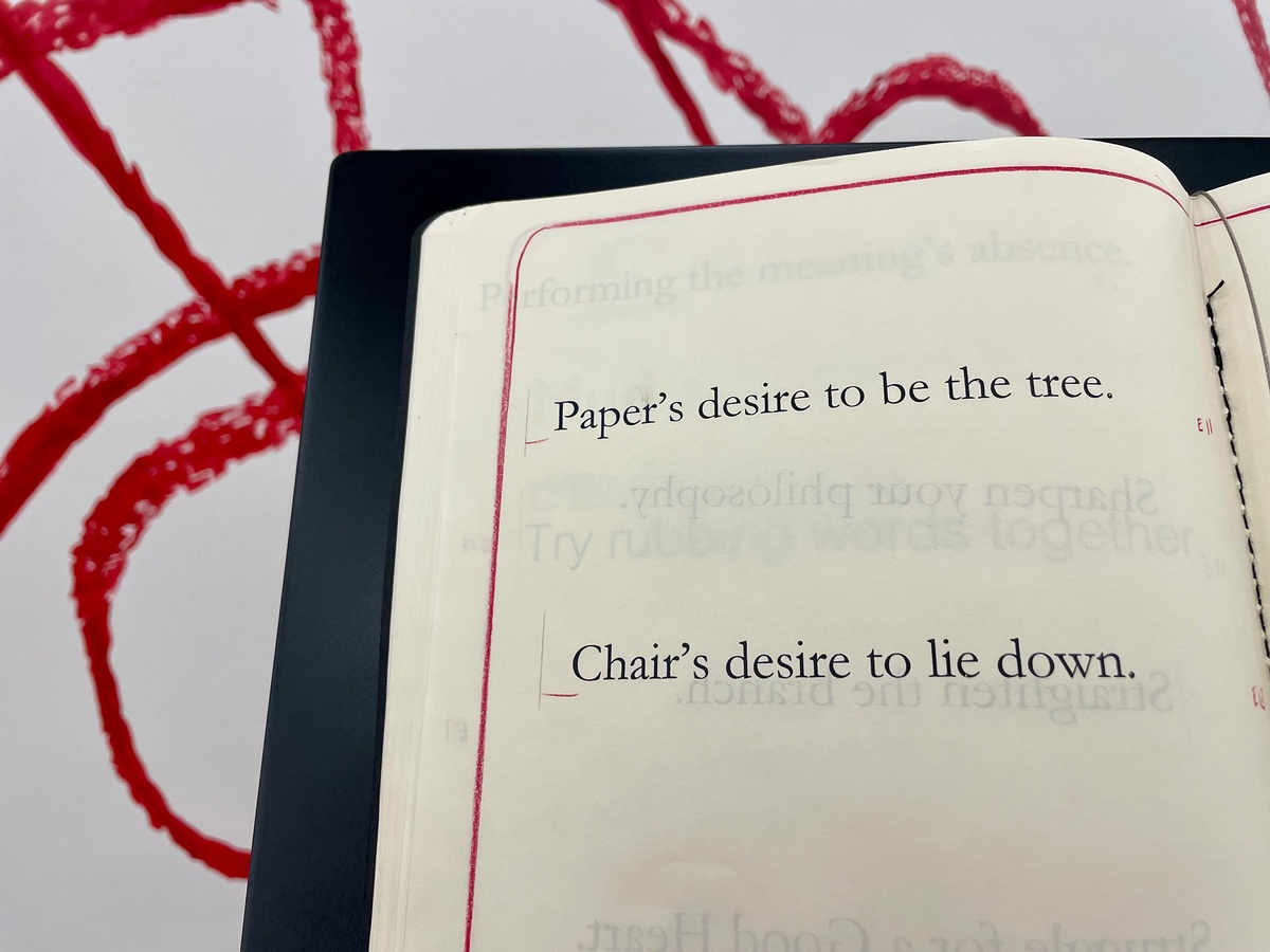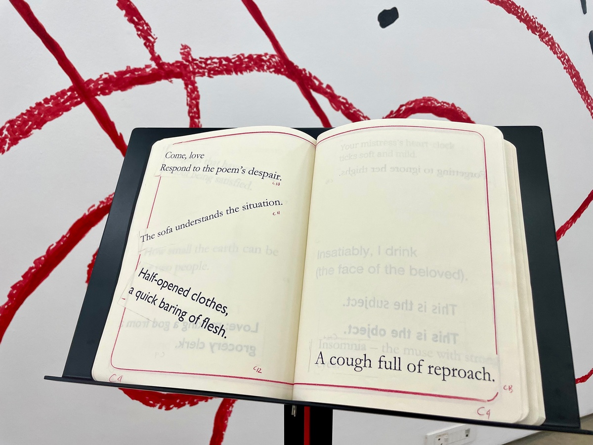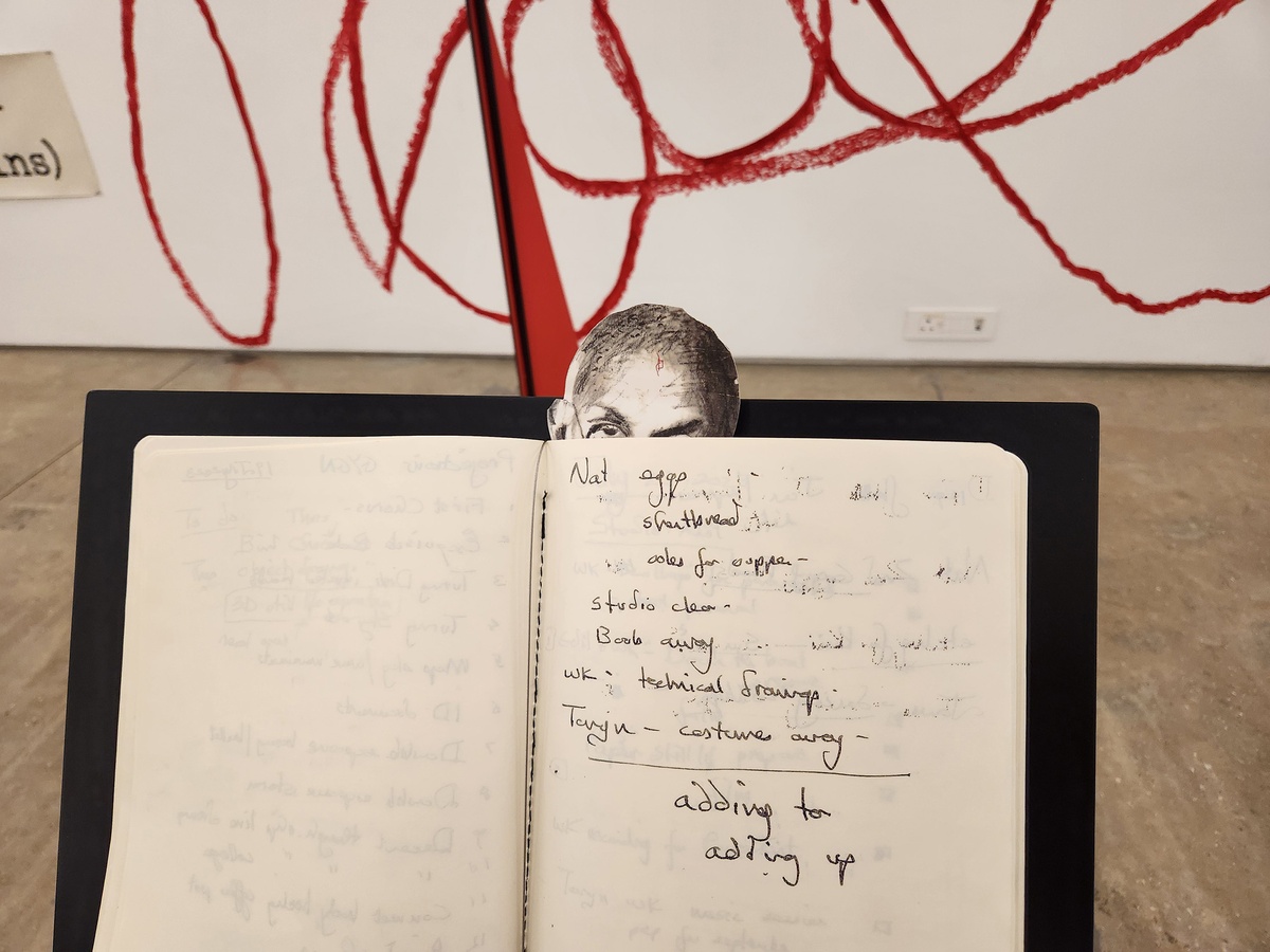 Any notebook often contains these mental wanderings. The smell of mangoes interrupting productivity. A doodle in the corner. A list of groceries on the side. Shorthand that only the writer can decipher.Across the installation, we might see something that transcends the margins even further – an eye peeking out at us from inside Notebook 25.