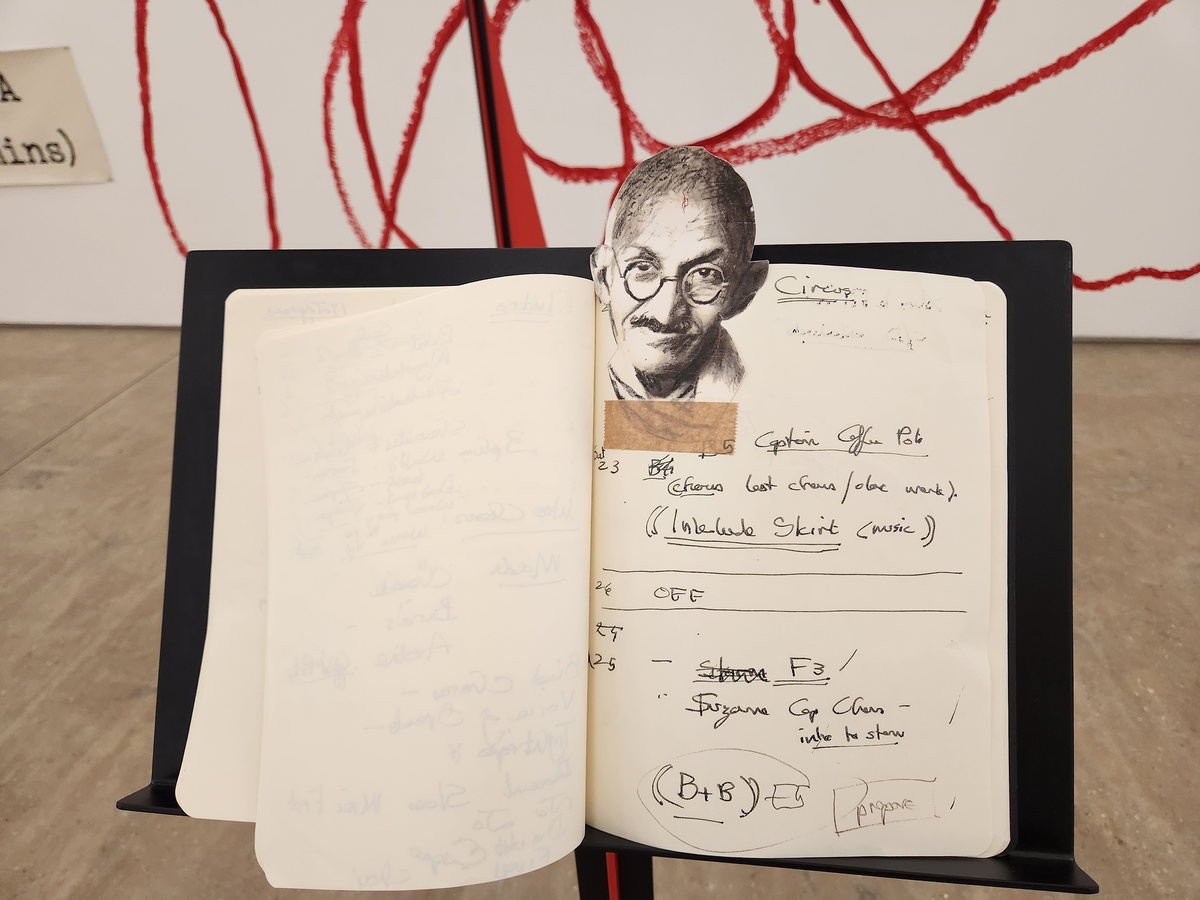 Notebook 25 carries the preparatory notes for The Great Yes, The Great No (2023) – part play, part Greek choir, part chamber opera. The production narrates an escape on a boat from France to Martinique. The passengers include notable figures like André Breton, Claude Lévi-Strauss, Wilfredo Lam, Victor Serge, and Anna Seghers, amongst others.Mahatma Gandhi appears amongst the planning ephemera, extending past the edges of the notebook. He is not mentioned as one of the passengers, but perhaps he was considered to be included at one point.
