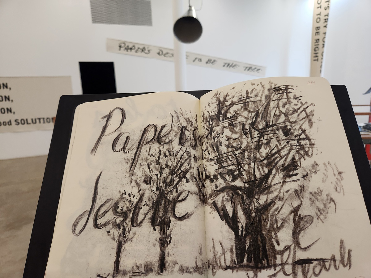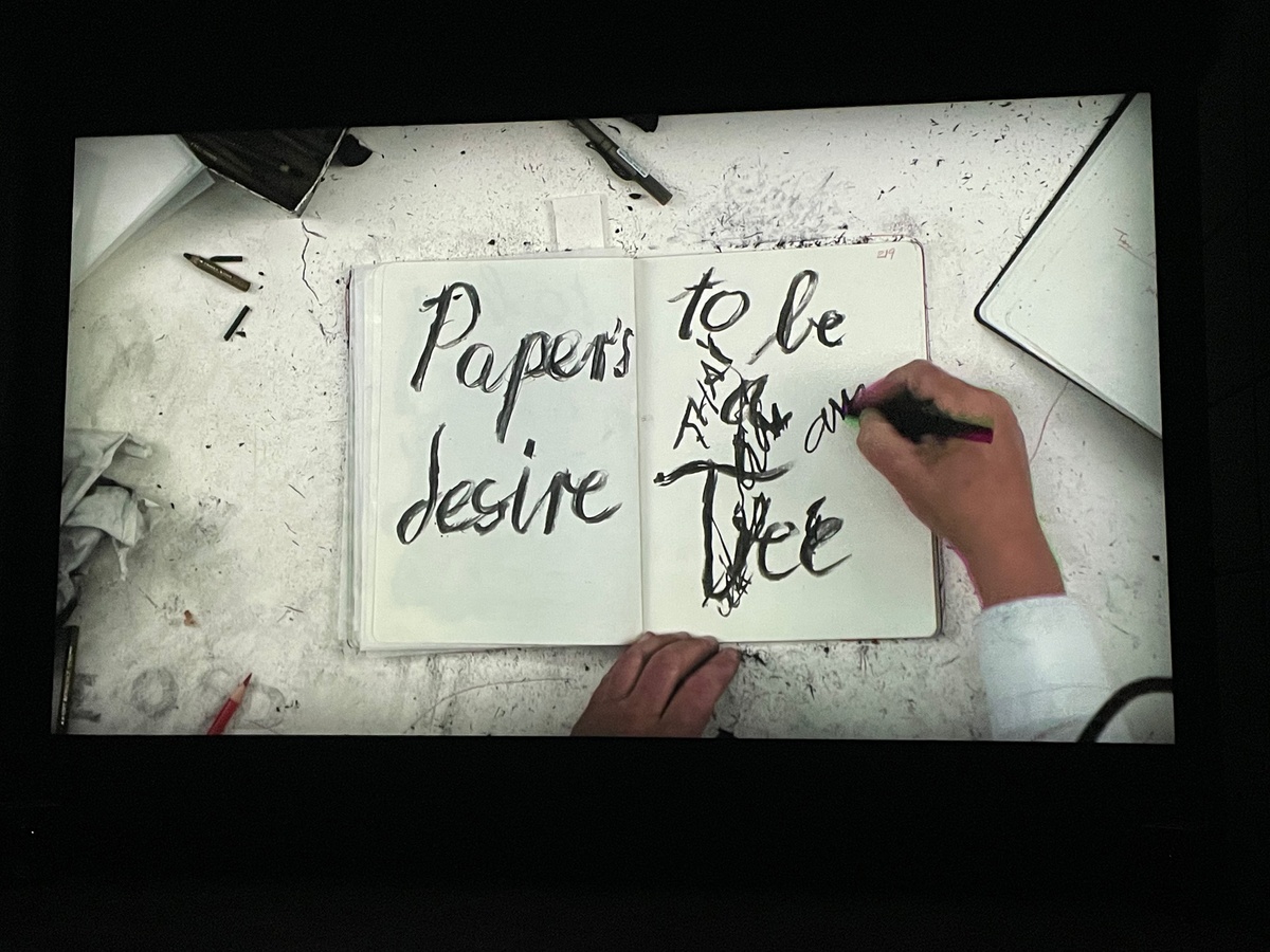“Paper’s desire to be the tree,” types Kentridge, in Notebook 26. Including this appearance, the phrase appears four times in History on One Leg.The second time is in Notebook 29, a copy of the sketchbook that the artist uses to create and animate Fugitive Words. The film plays in the media room across from the book, and gives us the third instance of the phrase.