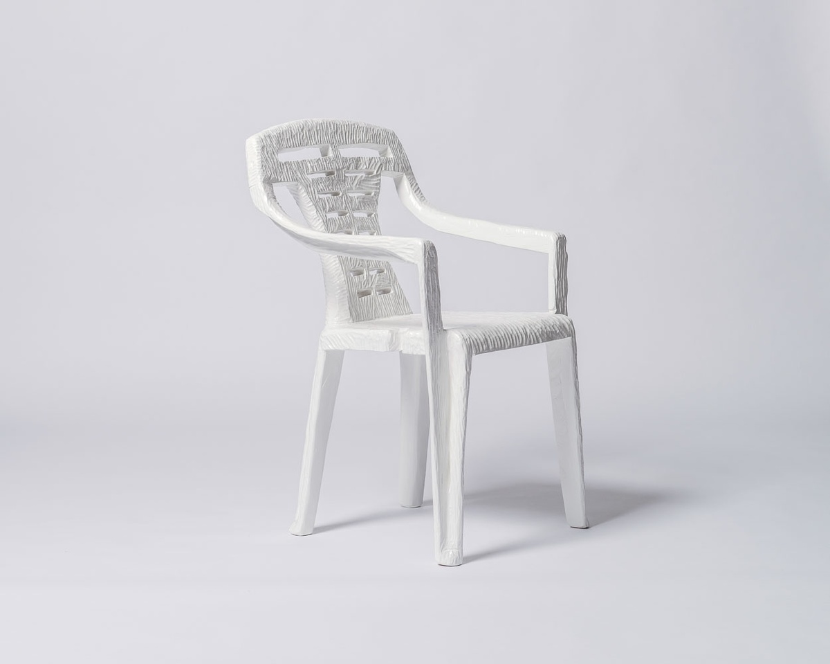 To sit or not to sit? That is the question for Cameron’s Platter’s sculptures.In an interview for Krone’s journal, he echoes this ‘re-socialisation’ process of the chair: “In my carving a piece of wood to look like a plastic chair, I’m ‘totemifying’ those original objects… I’d say that I use [them] to meditate on culture, and try to help me make sense of the world.”As an incidental coordinate through popular culture, chairs take us through a history of modern design. Platter suggests a Slow Dance, following the title of the work.[verbs: slow dance, ‘totemify’, make sense, trace, design]