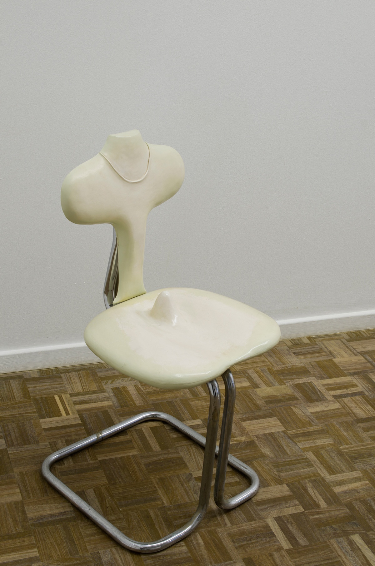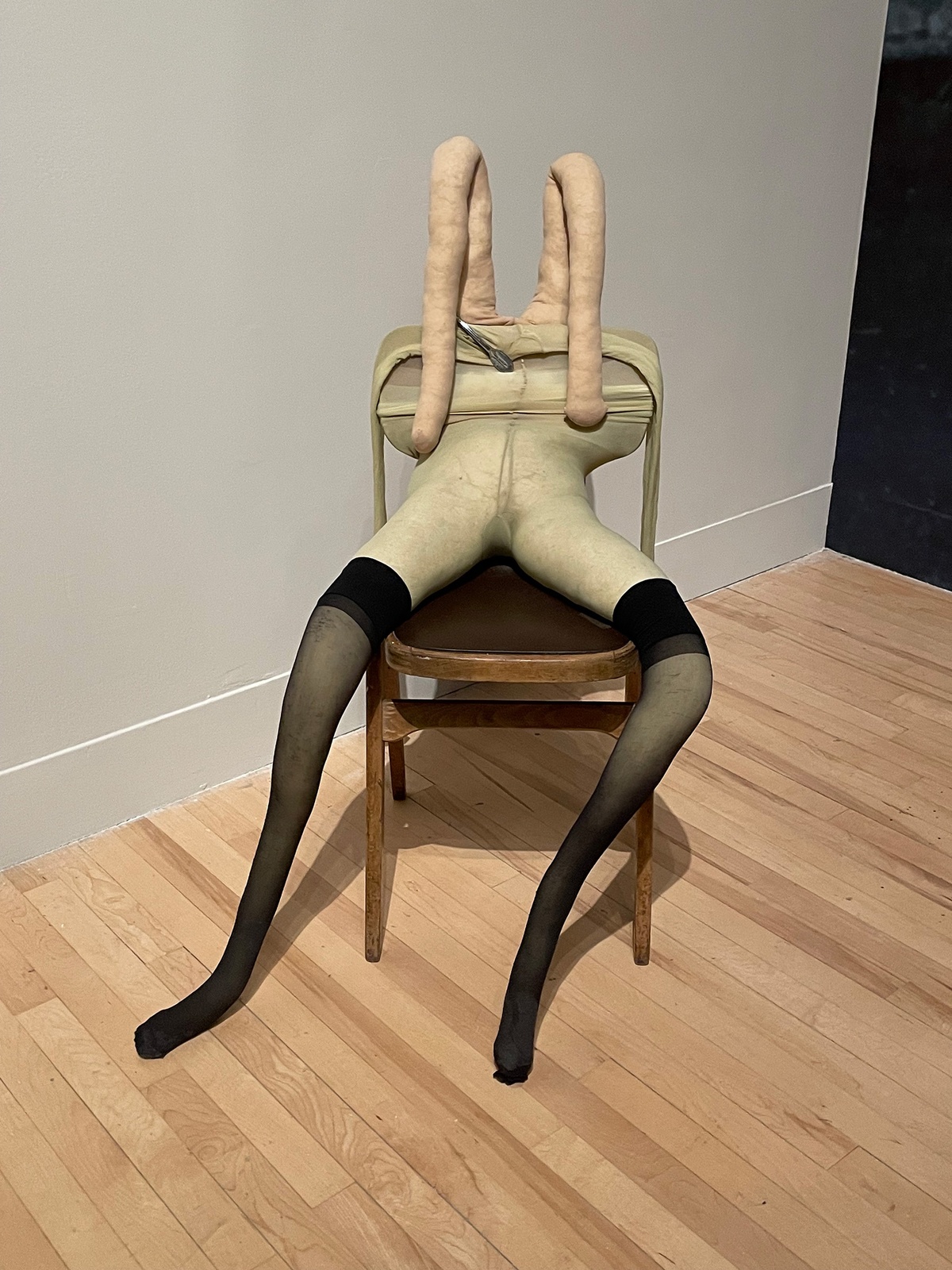 Sarah Lucas is another such artist who has been engaging with chairs. Since 1992, she has used them as a way to “accommodate the human body sitting... Generally as a support for an action or object. Changing light bulbs. Propping open a door. Posing. Sex.”Her infamous soft, leggy Bunny (1997) is draped over a found chair, imbuing the form with personality and viscerality, while solving the problem of structural support and getting the sculpture off the ground. While in other works like Excato (2018), the chair itself becomes a replacement for a pierced human body.[verbs: prop, pose, seduce, drape, support, pierce]