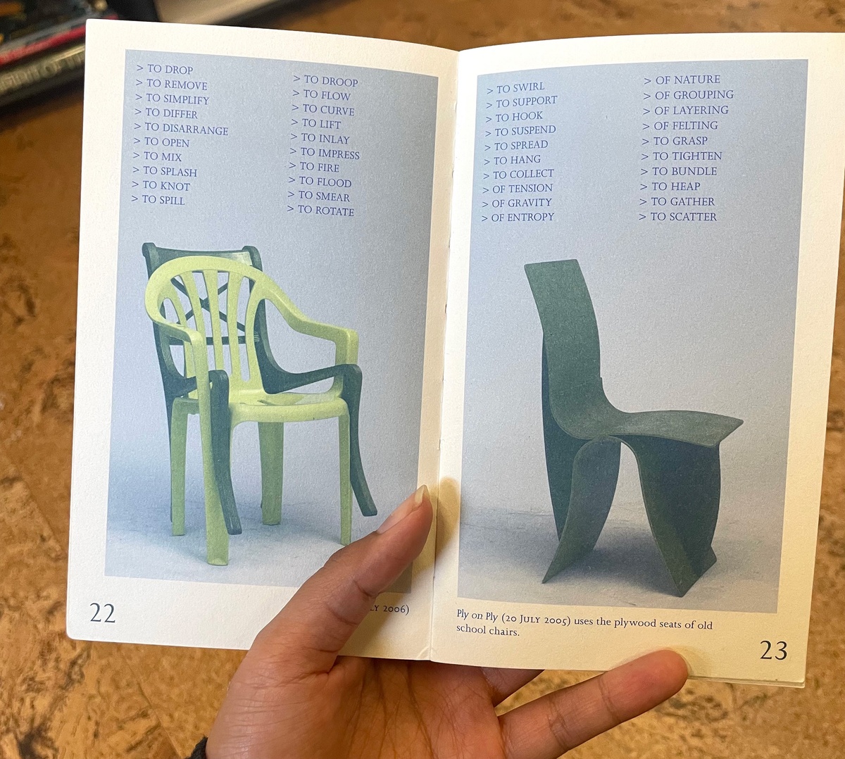 For Martino Gamper’s 100 Chairs project, where he constructed one hybrid form a day for 100 days out of parts of discarded chairs, Alex Rich proposed to include Richard Serra’s Verb List (1967) in the catalogue.Rich asserted its relevance to Gamper, quoting Serra saying, “I really just worked out pieces in relation to the verb list…what happens when you do that is don’t become involved with the psychology of what you’re making, nor…the after image of what it’s going to look like.”