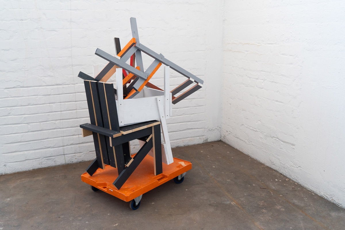 Another example of a chair telling us about its material process is Xandre Kriel’s The Piek, a chair which lies in pieces in A4’s storage facility, where Kriel spent time on residency. The chair, leaning against the wall, was waiting to be made useful through the performance of assemblage.Even in its final utilitarian form, the angles of the chair only make for temporary sitting in an stern posture – for use on the threshold of another activity, like tying one’s shoes.[verbs: assemble, perform, transition, sit on the edge]