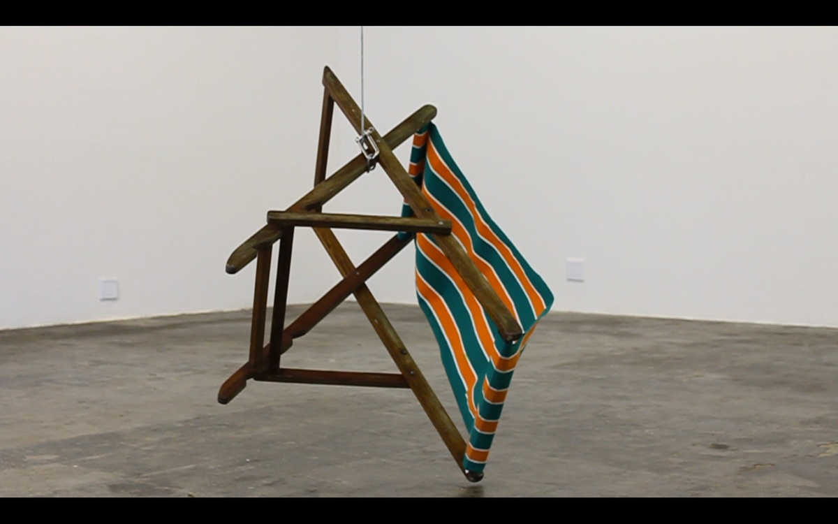 Also held in a similar state of limbo, one of the activations in Jared Ginsburg’s Hoist (2011) features a deck chair being strung up by a cable, and in this vulnerable position, is relieved “of its utility, jogging familiar associations and prompting an alternate engagement,” as the exhibition text explains.Hoist describes a brief moment when the chair’s formal qualities turned into a sculptural proposal.[verbs: hoist, relieve, hang, expose]