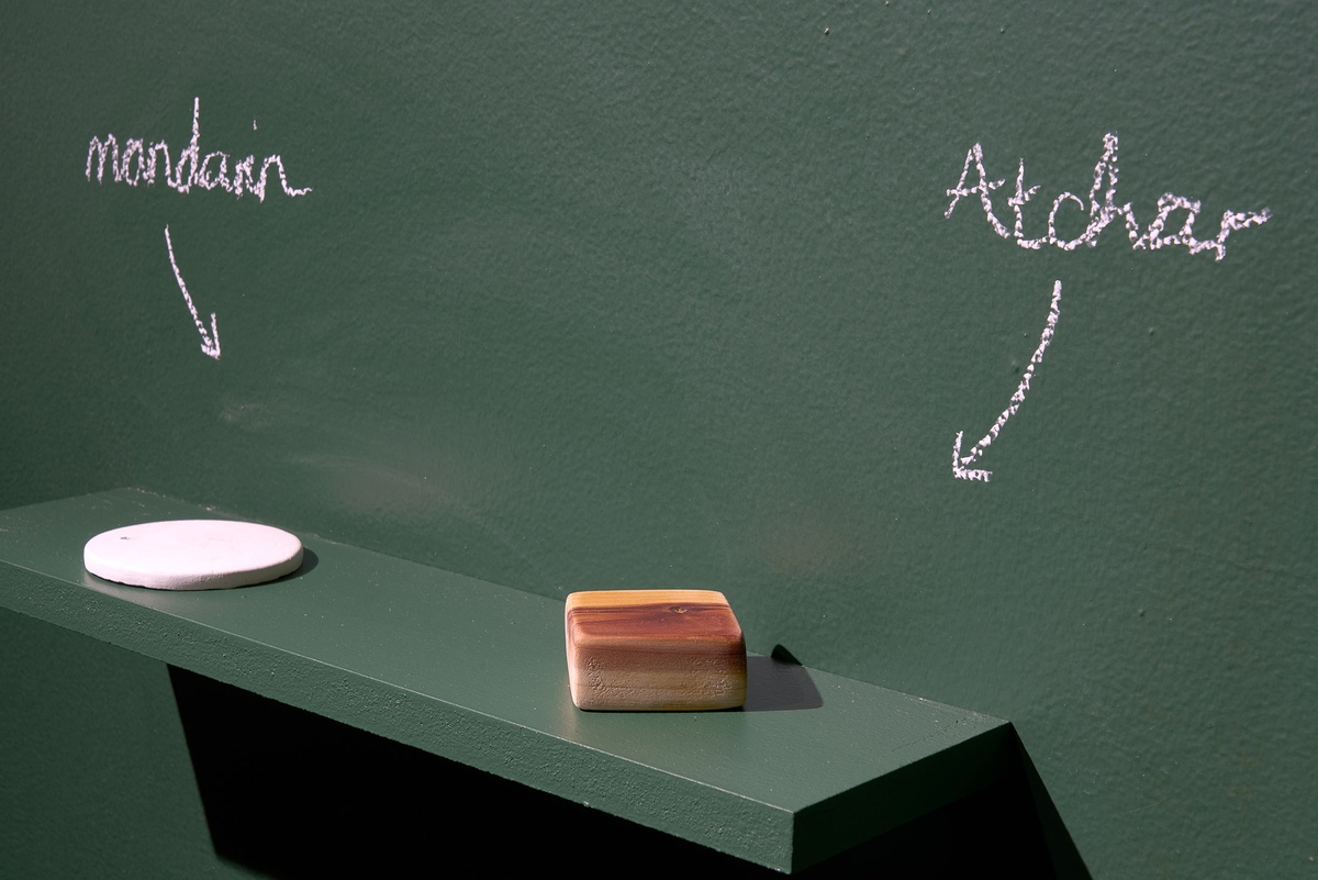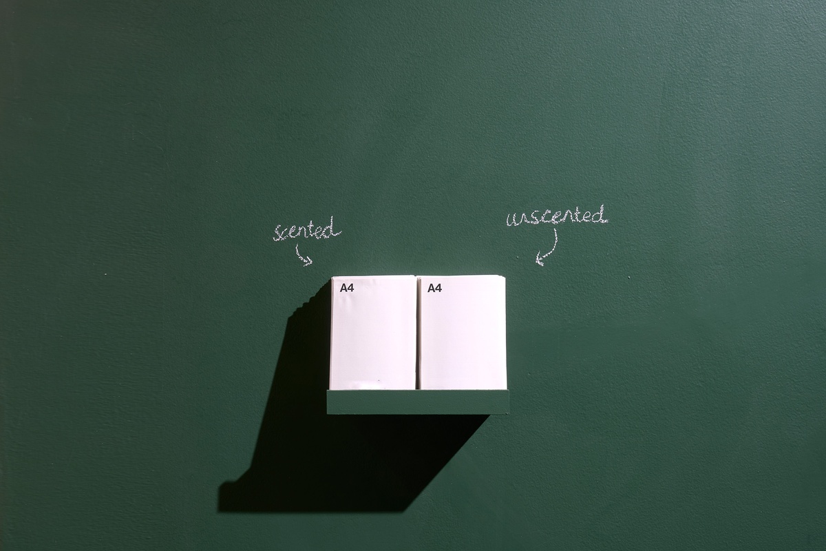 For this test, the curator saturated one cedar wood block with atchar oil and one ceramic disc with mandarin oil to evaluate the radius of the aroma and how long the smell lasted.