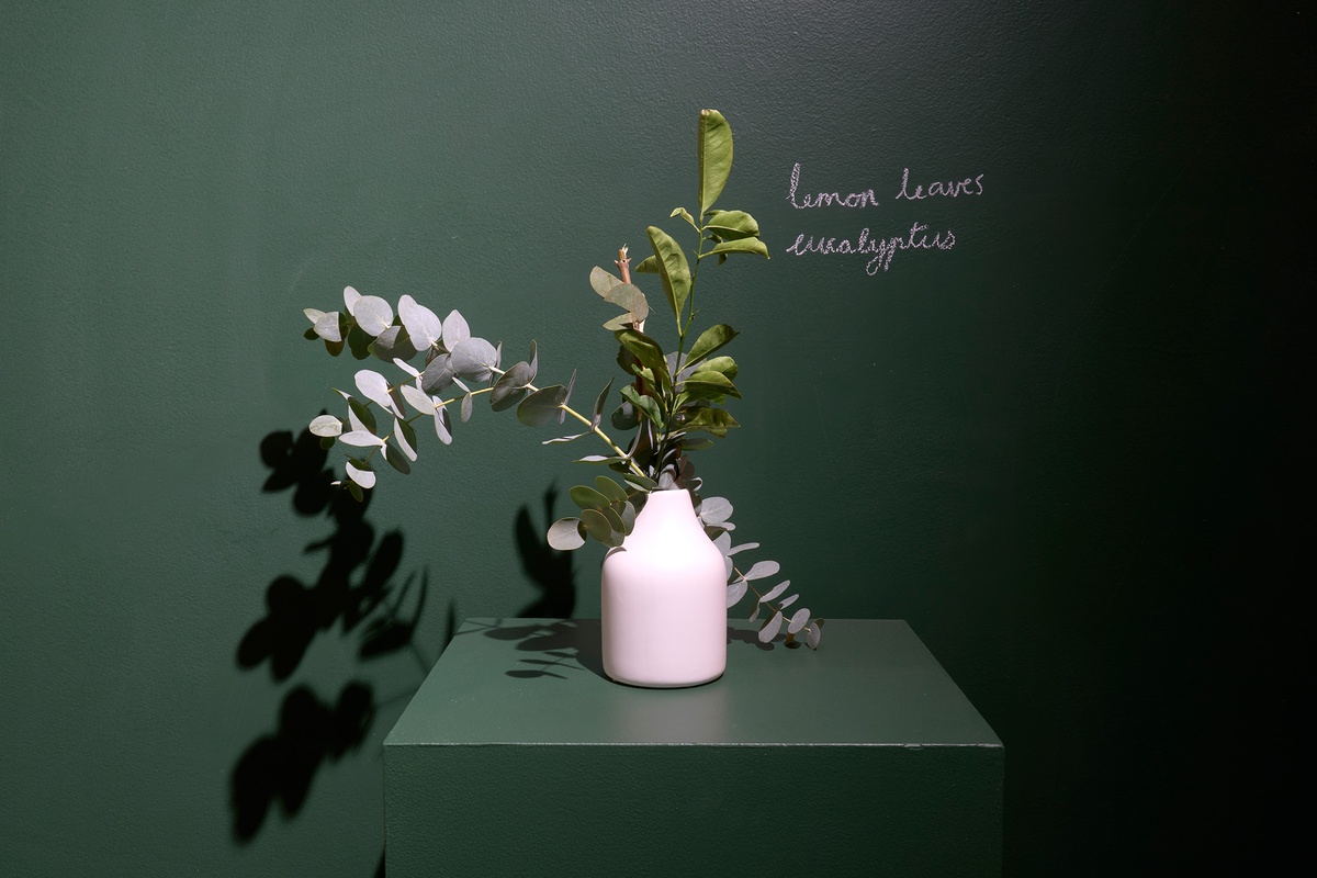 The curator was interested in testing ways that plants can introduce scent into an exhibition. Mindful of the allergens that flowers can release, Davids made an arrangement using eucalyptus and lemon leaves, gently bruising them to encourage the release of their oils.