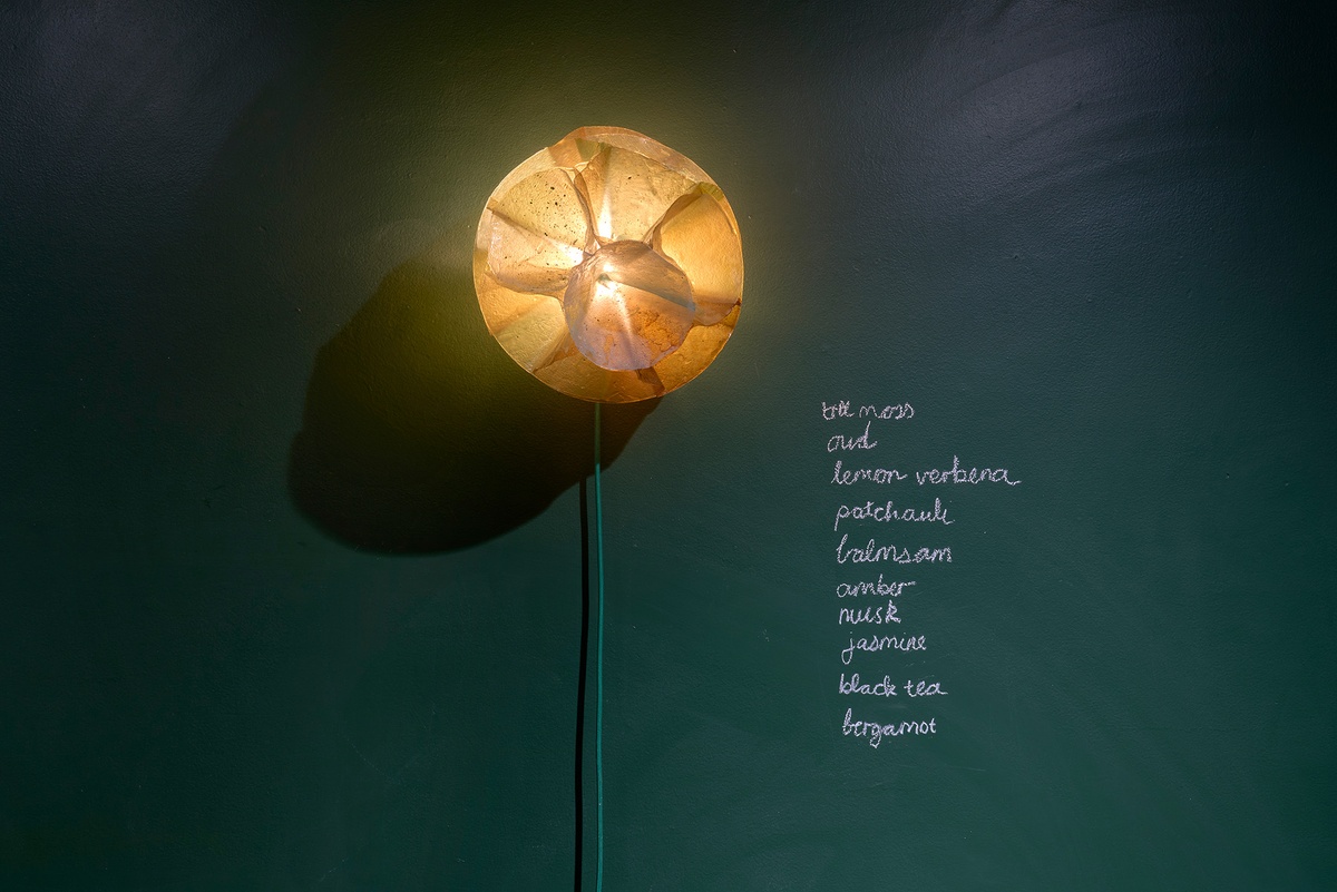Georgia Munnik’s Strangling Fruit acts as a holder and diffuser of a handmade perfume. Titled Phenotype 13, the perfume has notes of tree moss, lemon verbena tinctures, white musk, jasmine, and patchouli, amongst other ingredients, which were sourced and synthesised by the artist.