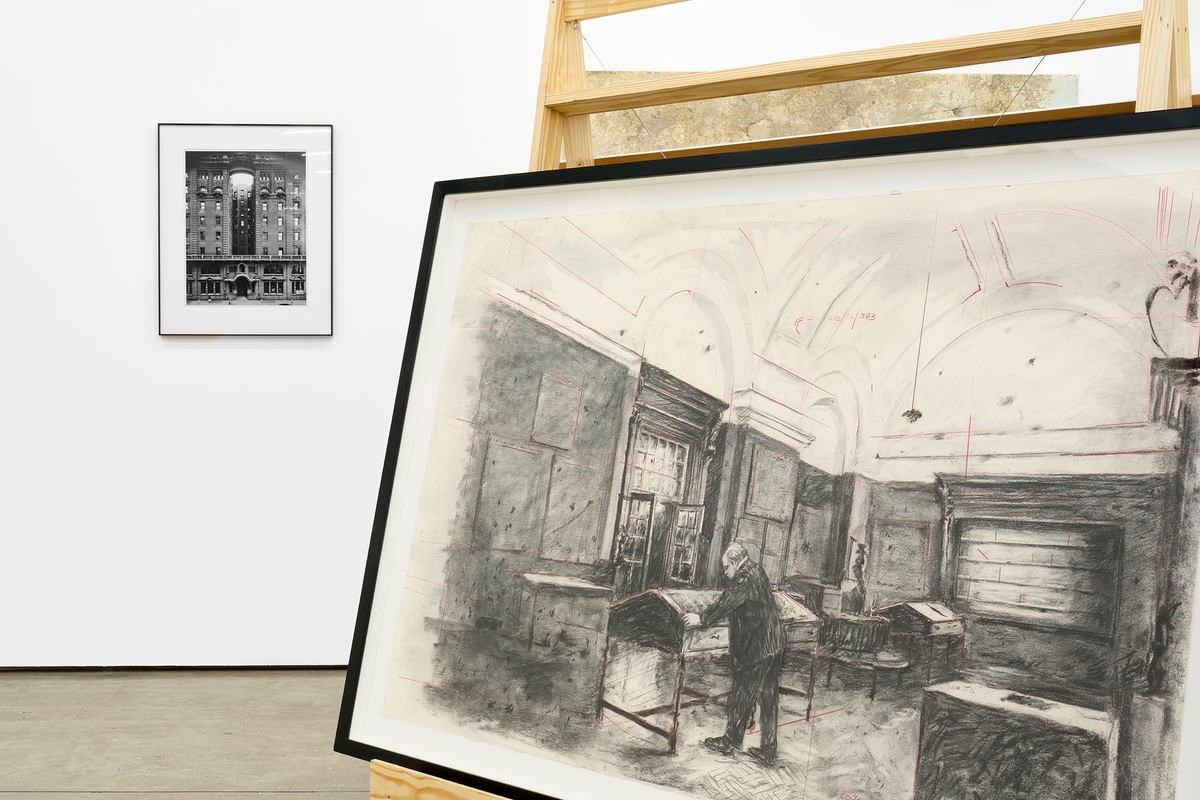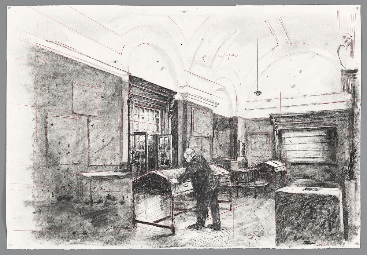 The last is a figurative drawing that transcribes not only the architectural features of the setting but also its muted ambience. Suggestions of parquet flooring, of accumulated dust, of bureaucratic failings (bare shelves, effaced artworks, empty plinths) are conveyed with a spareness of detail that is no less evocative for its brevity.