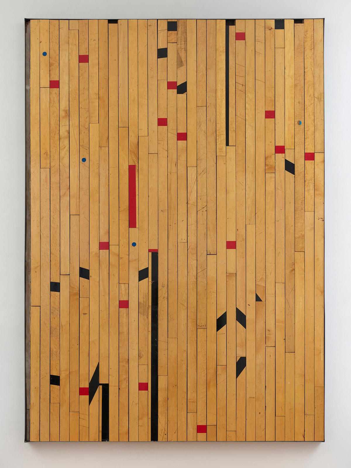 Further works offer themselves to be included in this Sightline. In one, the floorboards from a decommissioned school's gymnasium are reassembled as a minimalist composition. Seen in this new context, the eye is drawn to the patina of wear that marks the boards, those rubber-sole marks and scratches that recall an otherwise unrecounted social history.