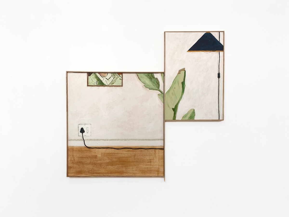 the second is more quietly commonplace, recalling features of a Johannesburg childhood home (skirting and plug points) and other ordinary effects (pot plant and standing lamp). In an aspirational, if fanciful, flourish, a self-portrait of Picasso, partially cropped from view, is included too.