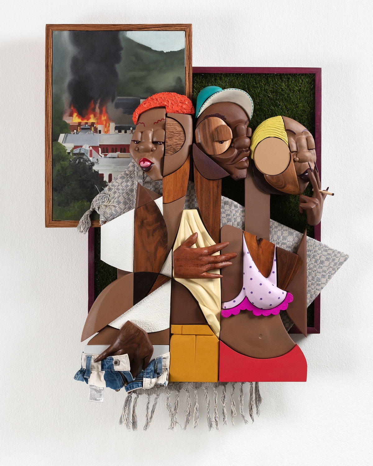 Other figurative works might also be included, two of which are offered here. Where the first pictures South Africa's parliament, seen ablaze in the background –