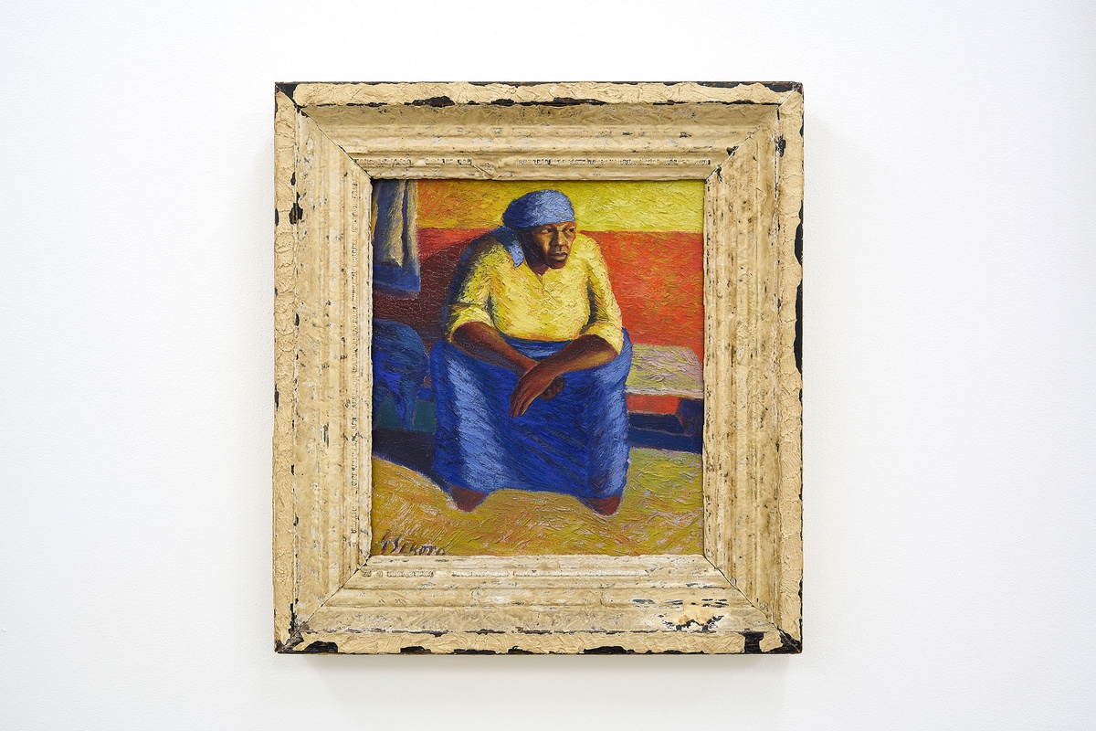 Aside from the skilled use of colour and form in Sekoto’s portrait of his mother Anna, the work’s frame exudes historical ‘aura’. Searching through books, we found that this frame is original, as seen (in better condition) behind Sekoto in a promotional portrait taken before he left South Africa.