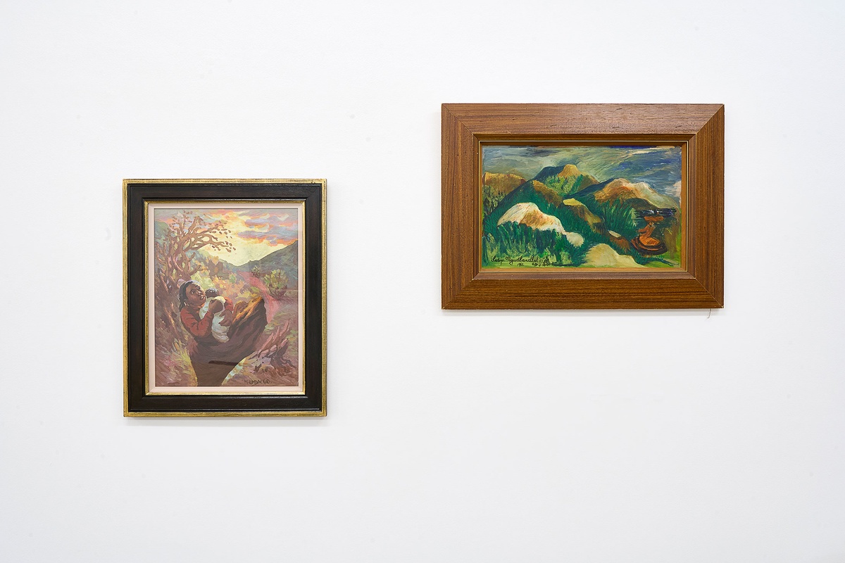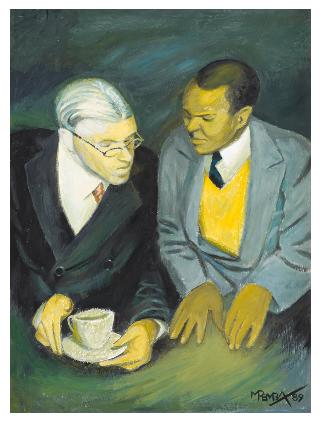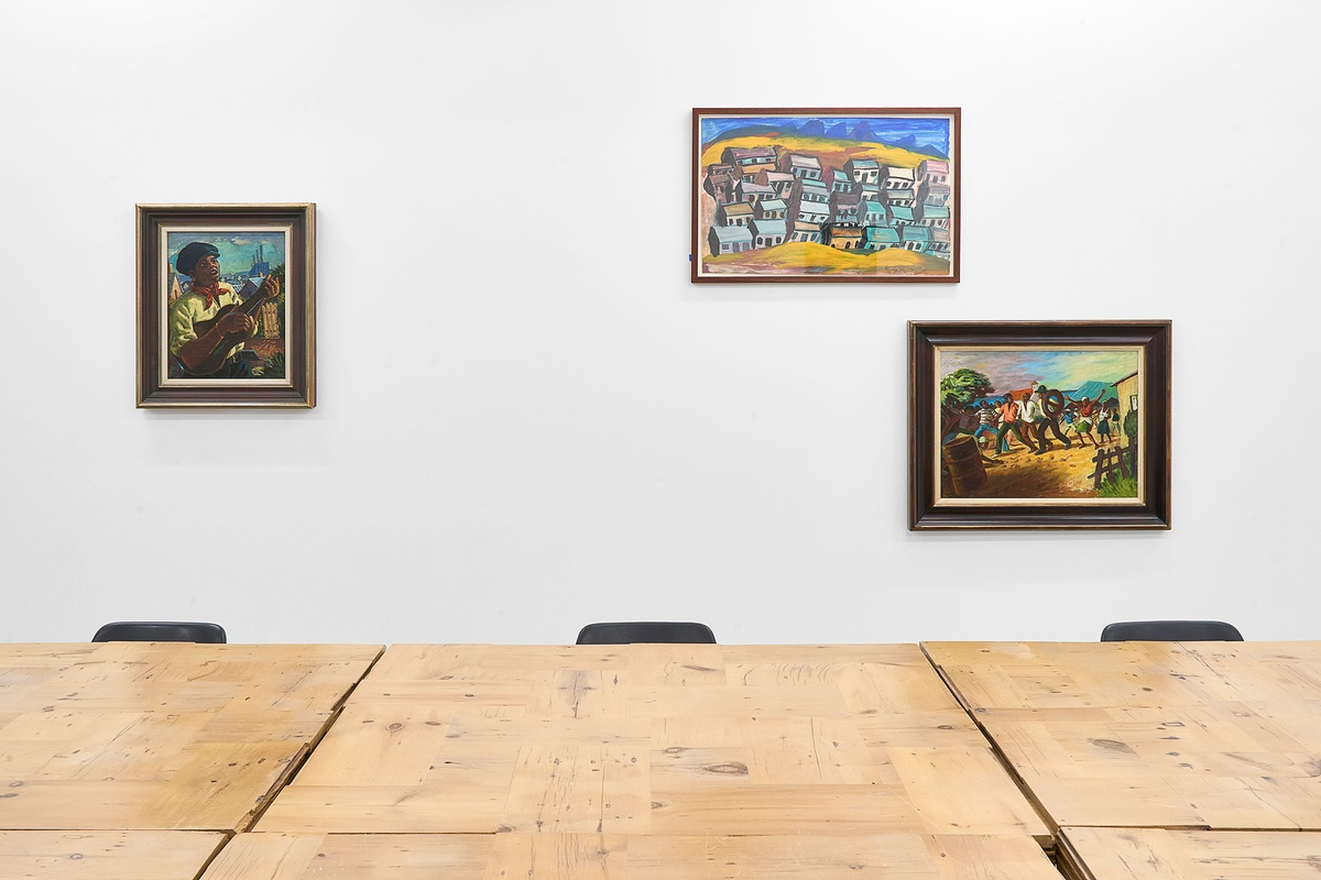 Both artists’ early artworks were primarily of the South African countryside.Mgudlandlu painted landscapes and portraits inspired by her childhood memories of life in Peddie.Pemba travelled throughout the country by motorcycle in the 1940s, depicting rural communities and the oral histories that they shared with him.