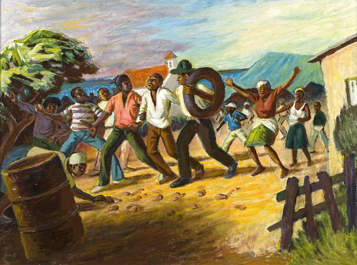 In the 1960s, after moving to Cape Town and then being forcibly removed from Rylands to Nyanga township, Mgudlandlu’s paintings began to express the claustrophobia and bleakness of living conditions for black people.This aesthetic turn was reportedly encouraged by Ray Alexander Simons, trade unionist, anti-apartheid activist, and co-founder of the Federation of South African Women.Mgudlandlu held her first exhibition in the offices of the Liberal Party in 1961.