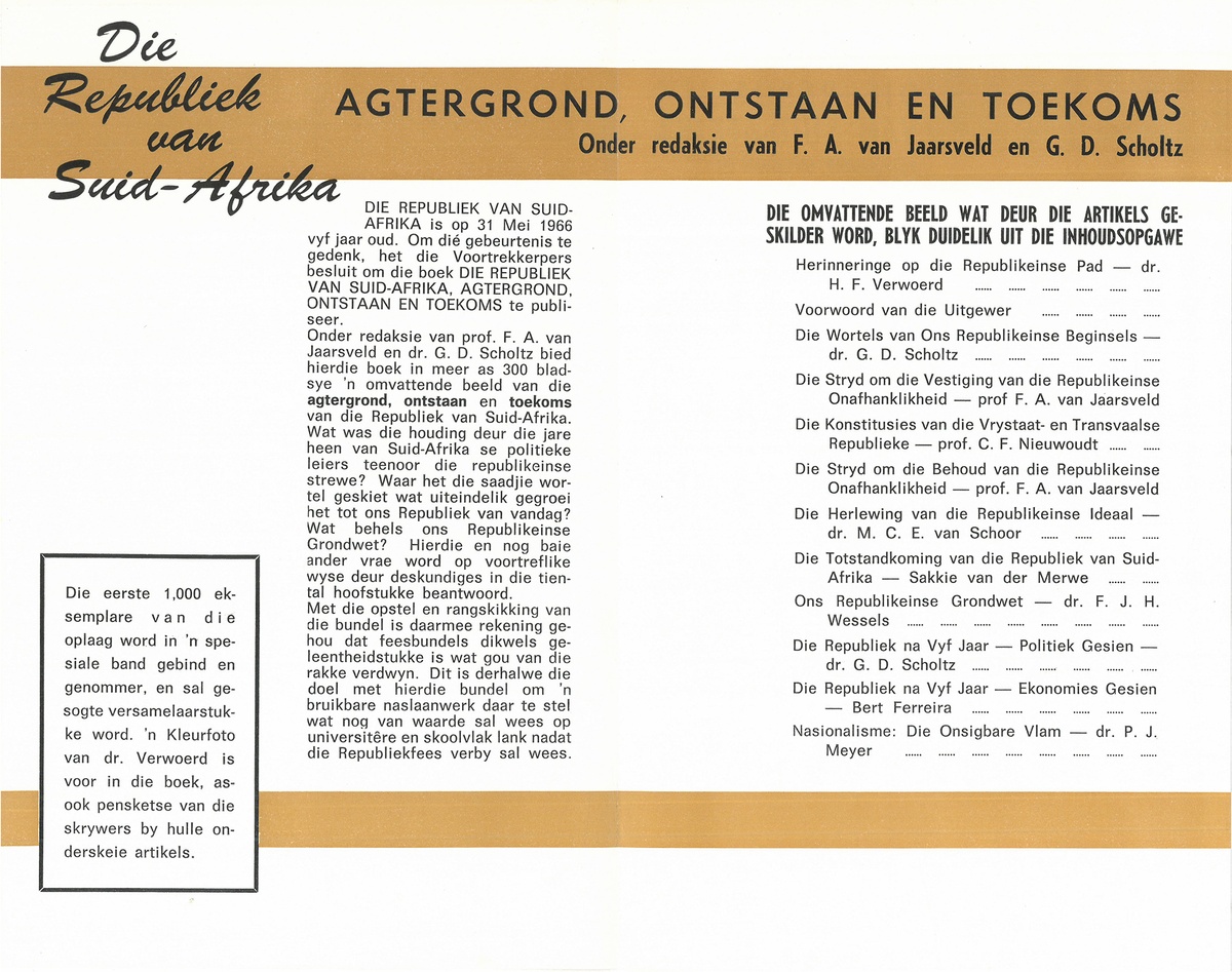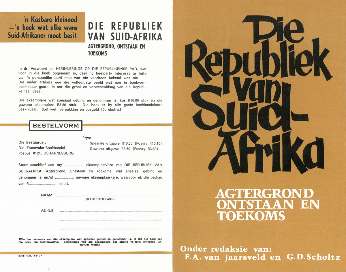 Hendrik Verwoerd is again recalled in an order form for a book published on the occasion of the fifth anniversary of the South African Republic in 1966. The form was found in the Library's Sixty-Six Transvaal Trees, a botanical survey with a nationalist bent, published the same year to coincide with the Republic Festival.