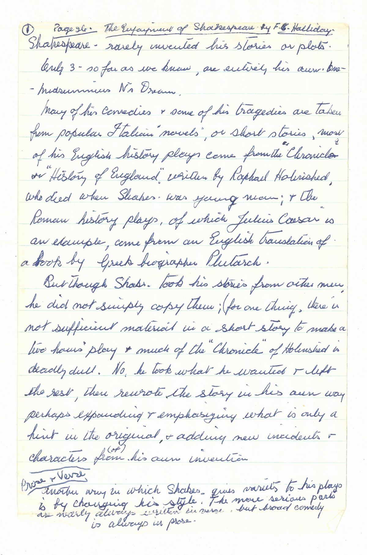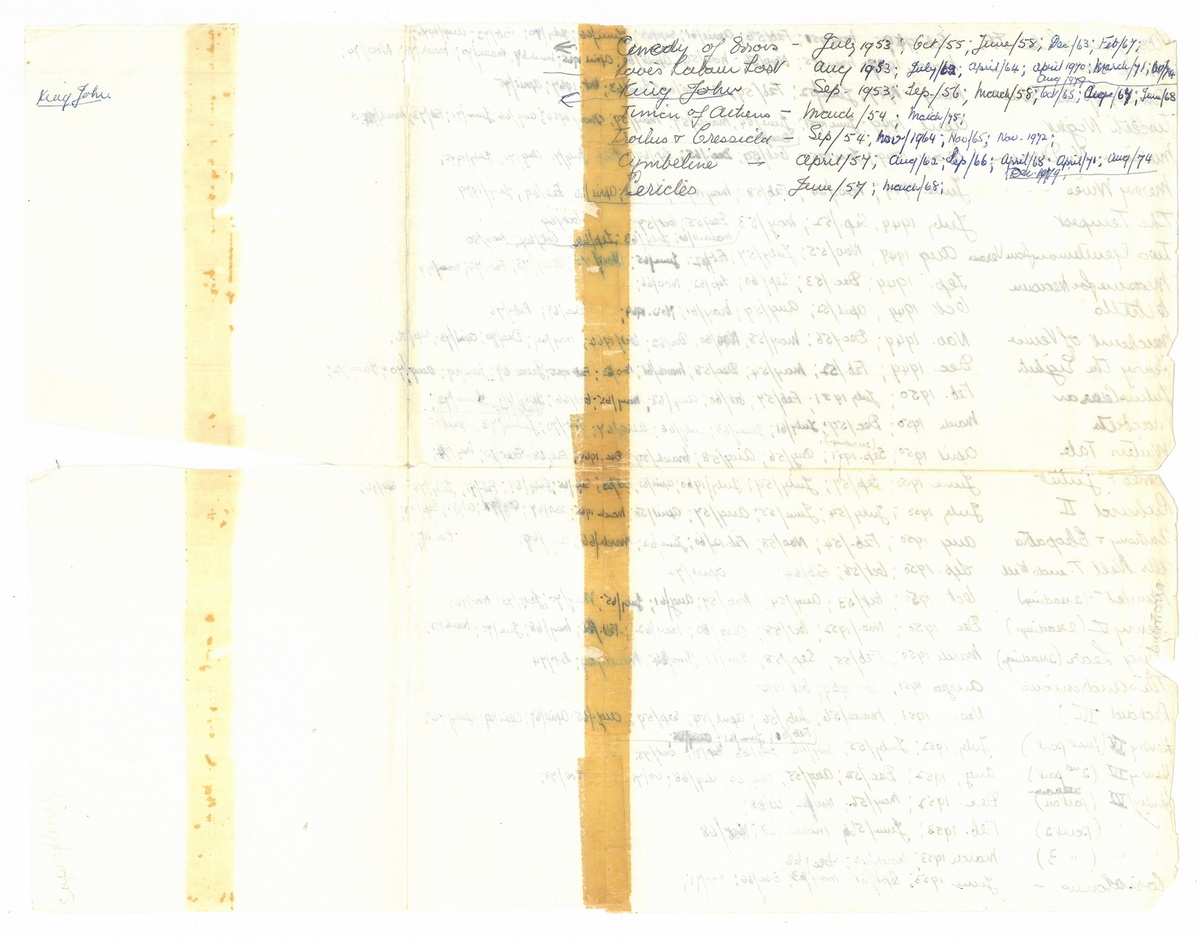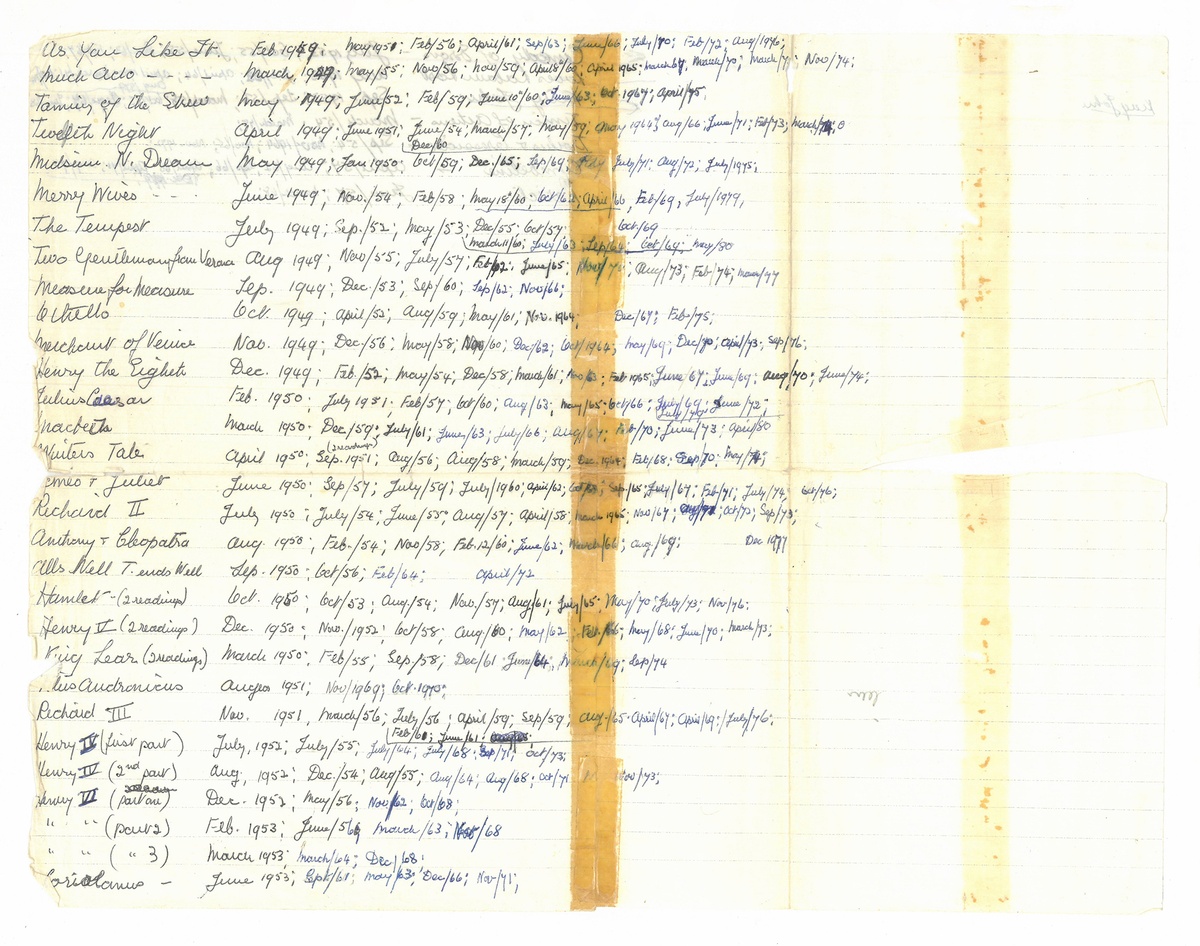 Among the loose sheets of paper kept between the book’s pages are summaries copied from John Wain’s The Living World of Shakespeare, a playgoer’s guide (1964) and FC Halliday's texts on the playwright, as well as a meticulous list detailing the many times Eva read and reread each play.