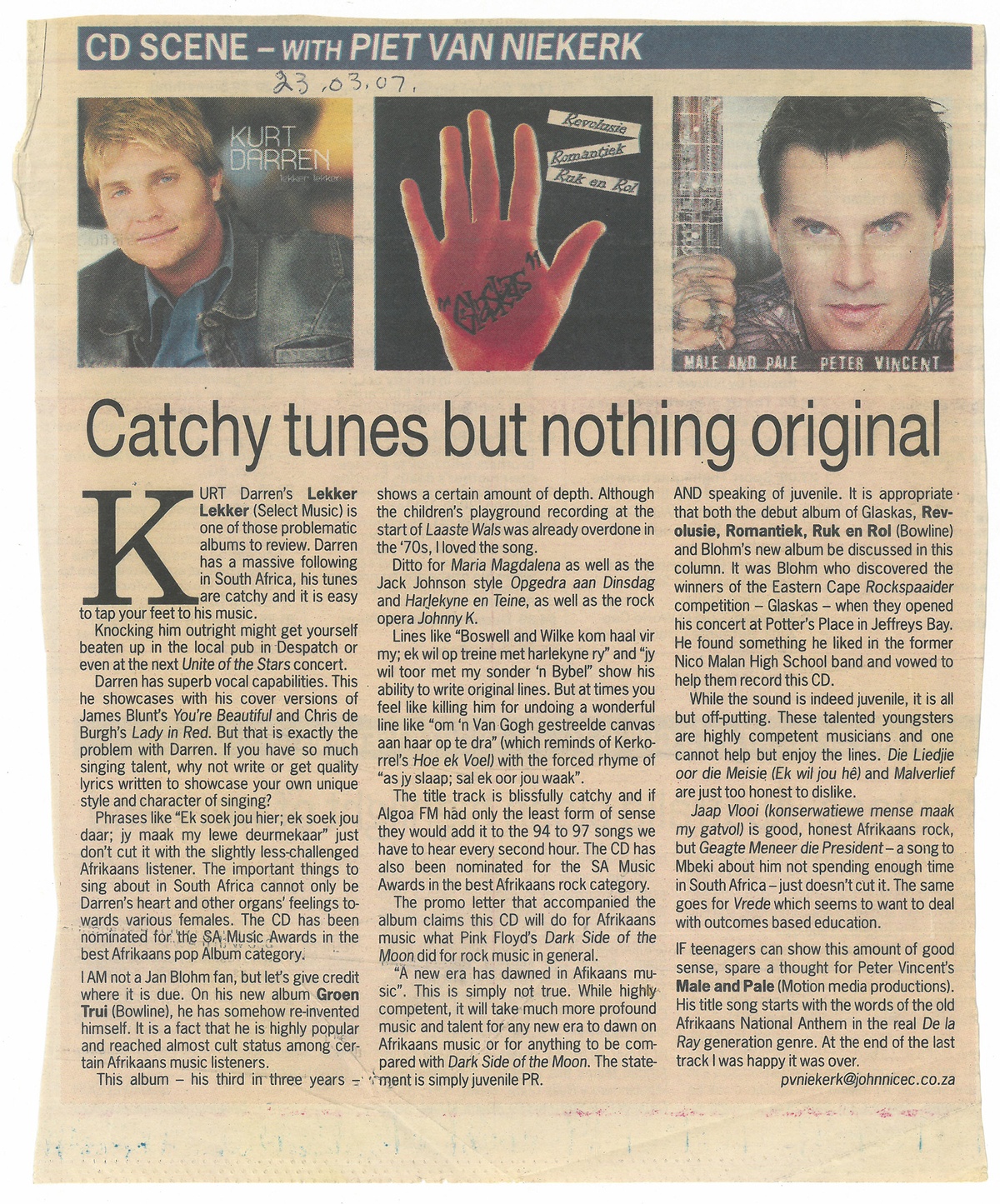 A social history of the country is recounted in a miscellany of matter, from a late-1970s advert for home insurance (R15.00 a month) to a less-than-enthusiastic review of local pop music, including Kurt Darren’s 2007 album, Lekker Lekker, found in the Library's copy of David Goldblatt's Some Afrikaners Revisited (2007).