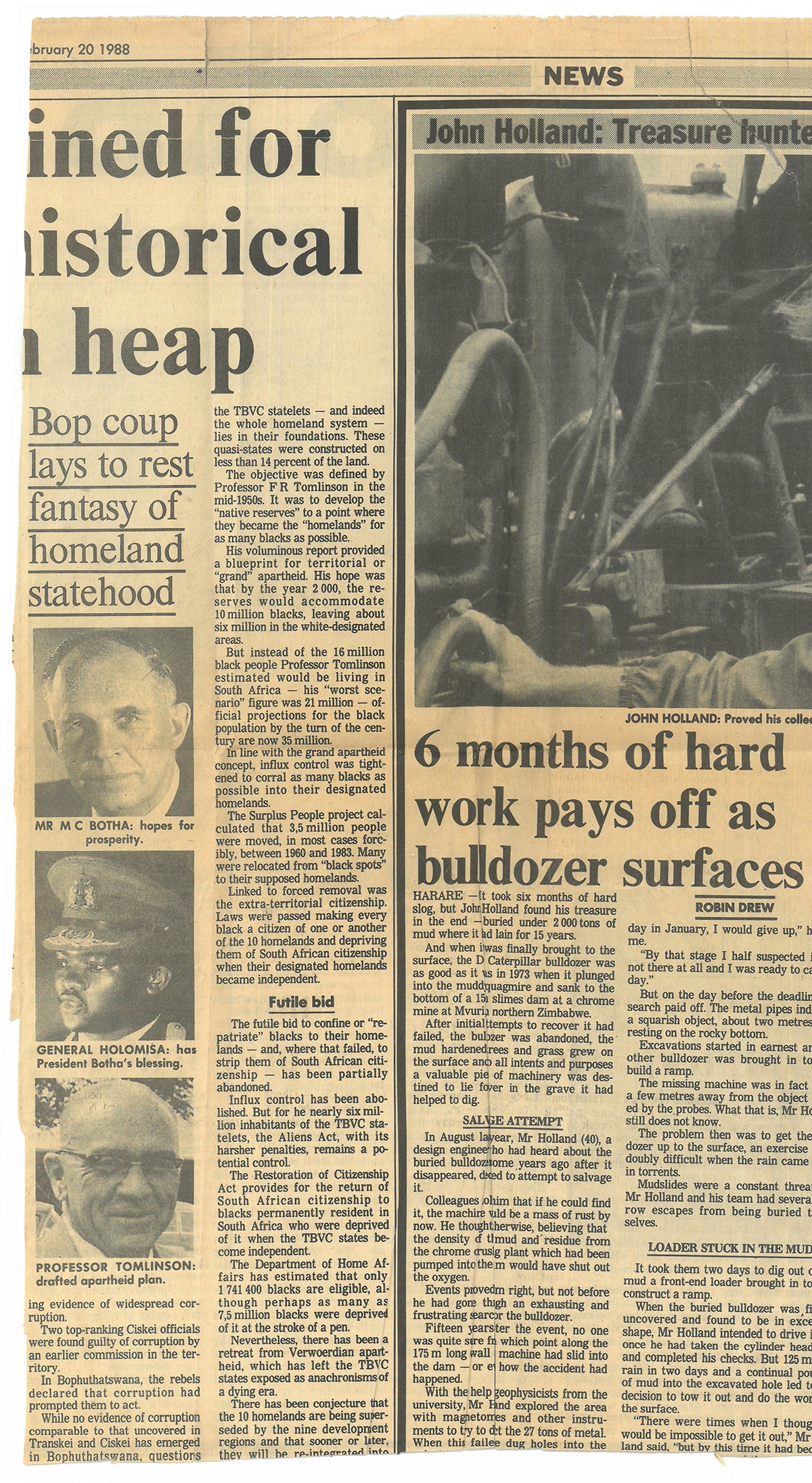 Others trace the country's political past. Oftentimes, however, the more curious story is told on the reverse of the newspaper clippings. In one such instance, dated February 20, 1988, a line anticipates the end of the white-minority rule and with it the administration of so-called homelands:
