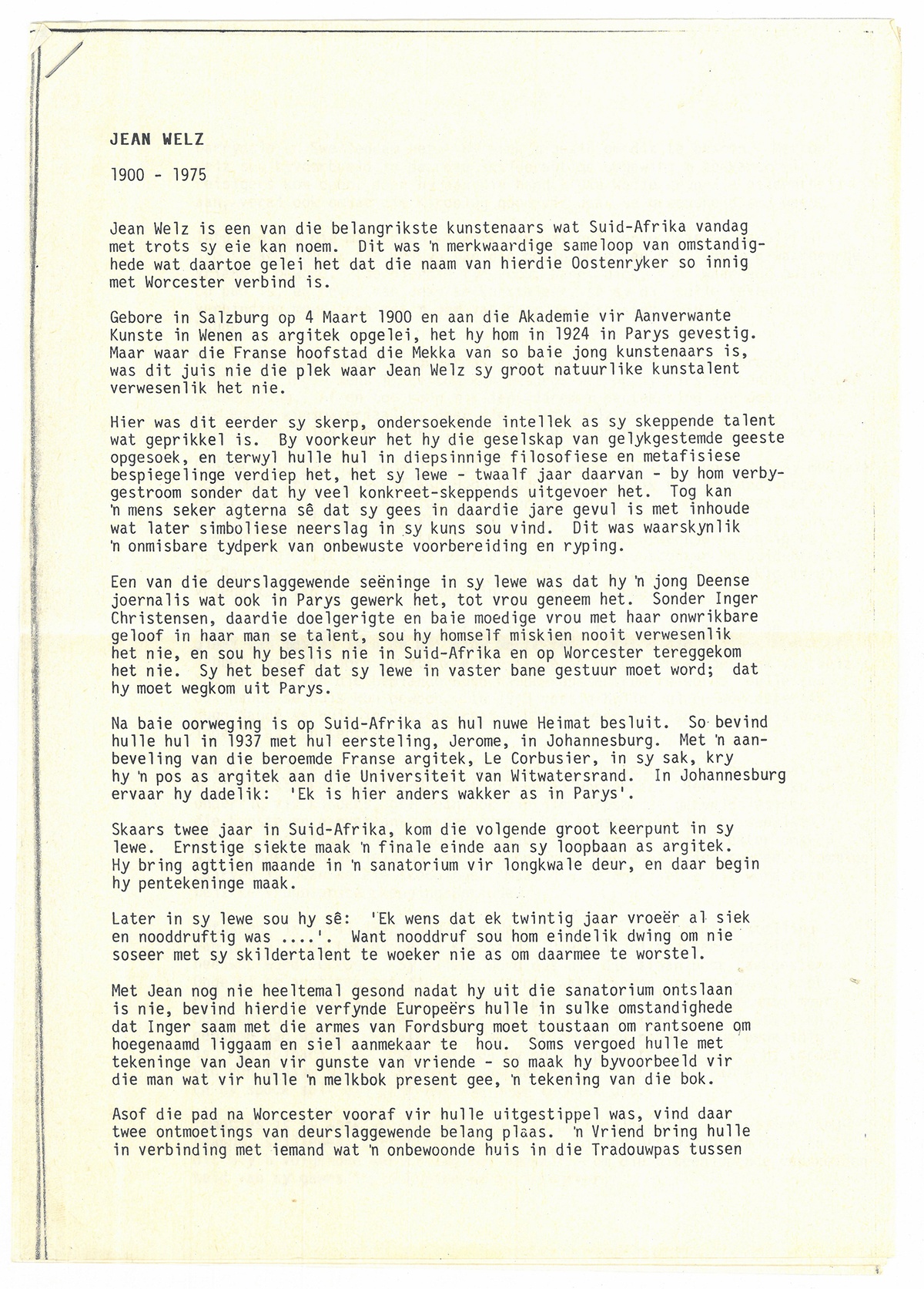 And a photocopied document (the original written on a typewriter by Johanna de Villiers in 1997) offers a summary of Jean Welz's life and work. The document was slipped between the pages of Esmé Berman's seminal Art and Artists of South Africa (1970).
