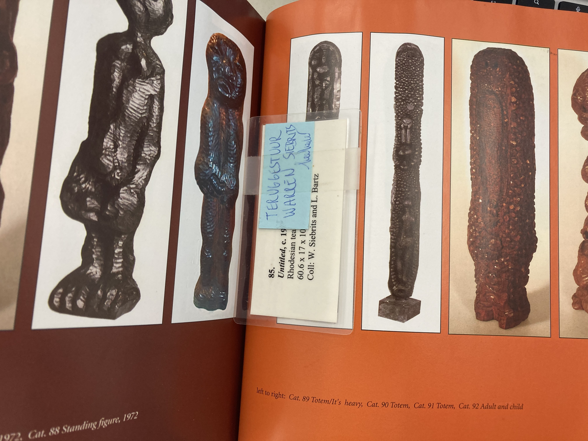 An artwork label from an exhibition with a handwritten note ("Teruggestuur Warren Siebrits") indicates that the untitled work is to be returned to the collector. The label was found in a catalogue made to accompany Cyprian Mpho Shilakoe's posthumous retrospective, marking the page where the same work is featured.