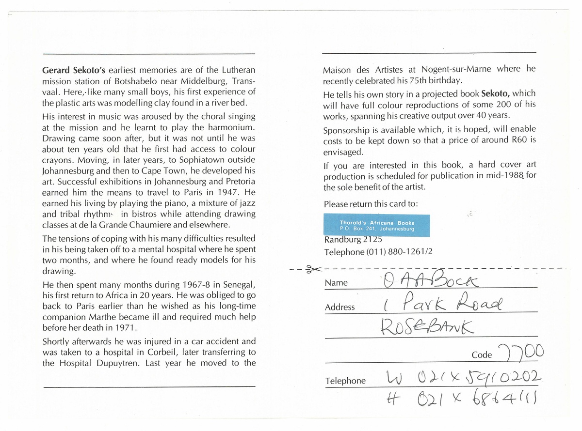 Another order form – filled out but never sent – for a then-forthcoming book on Gerard Sekoto lists the details of one OAA Bock. A brief online search suggests Bock published in several medical journals in the 1970s. His speciality was gastric ulceration. Perhaps, an A4 team member speculates, he wanted the book for his waiting room.