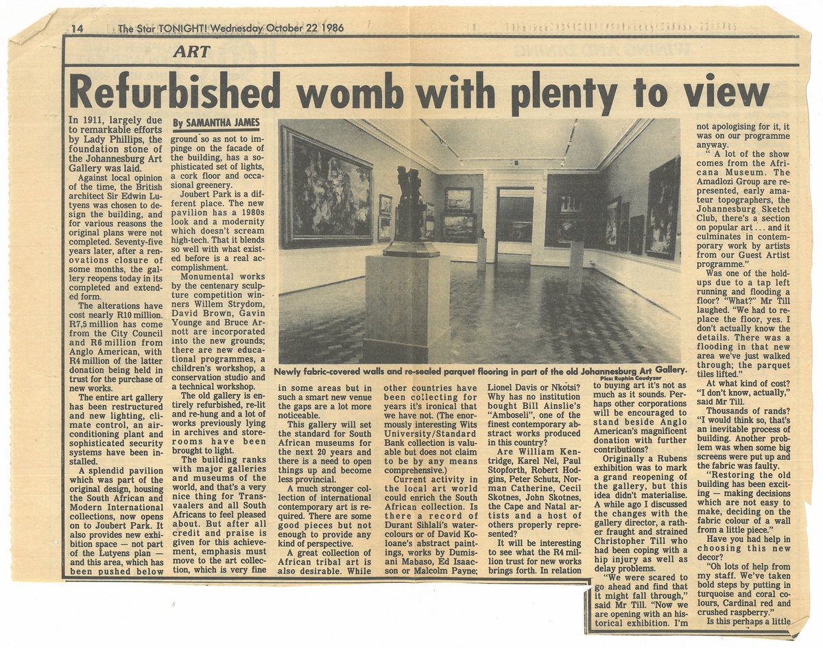 Other art-related finds include a newspaper clipping about the refurbishment of the Johannesburg Art Gallery in 1986, which cites oversights in the collection but is wholly impressed with its architecture: