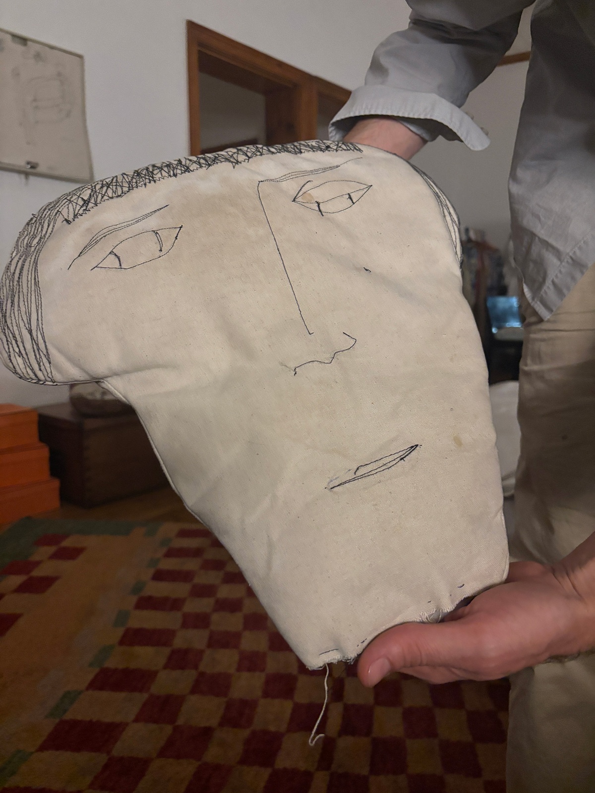 Inspired by these soft sculptures, Ginsburg collaborates with A4 Store to present pillow face (2026), a series of unique cushions embroidered with ten slight variations of the same face.
