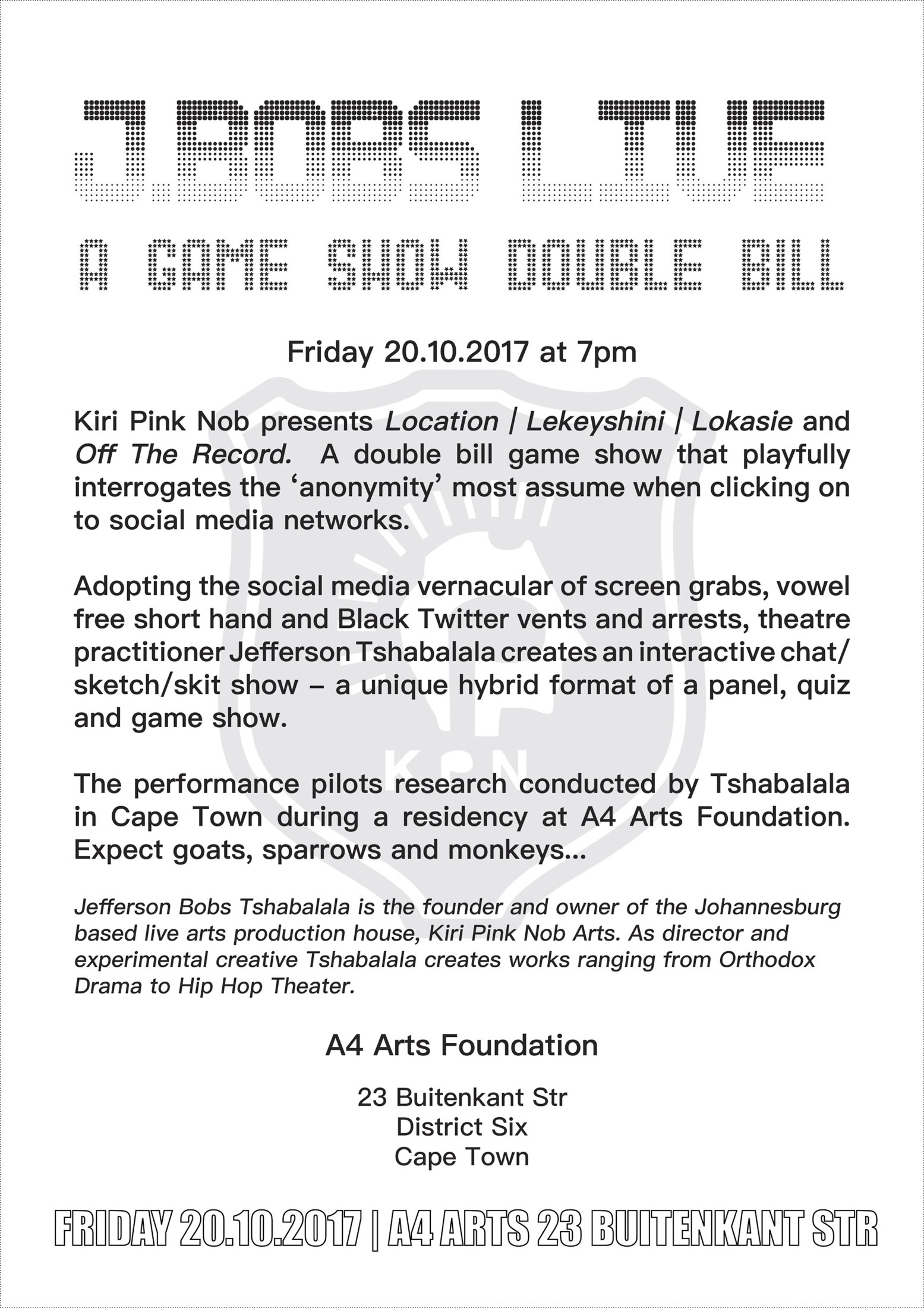 Kiri Pink Nob presents ‘Location | Lekeyshini | Lokasie’ and ‘Off The Record’, a double-bill game show that playfully interrogates the ‘anonymity’ most assume on social media networks.