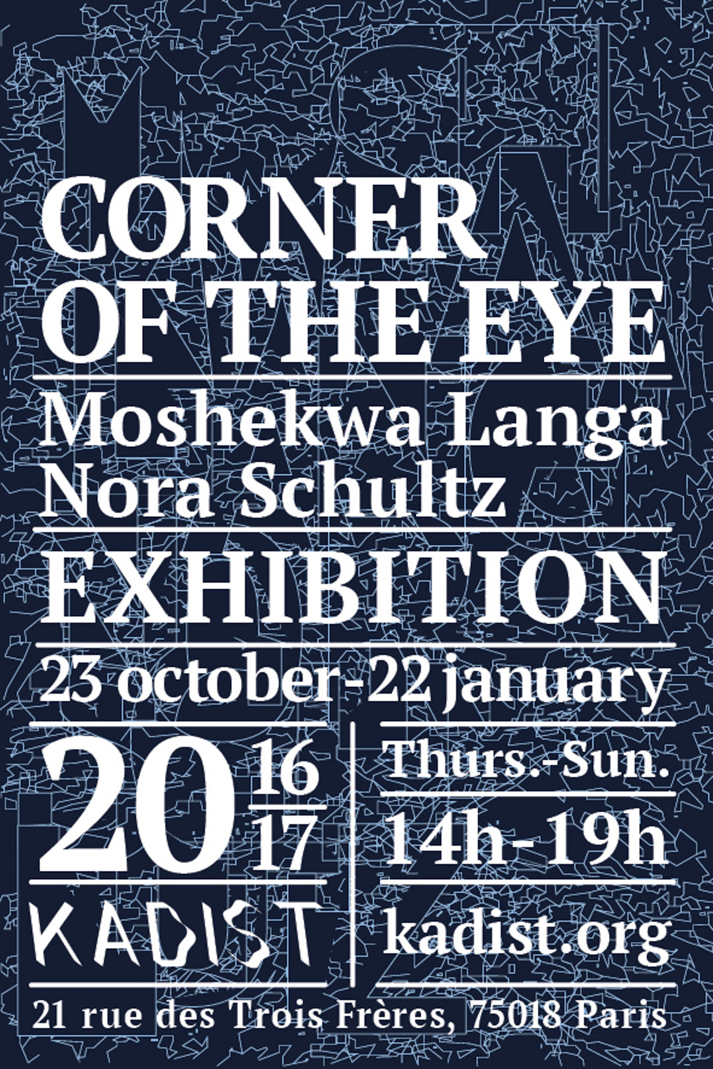 “Corner of the eye was composed by two artists, Moshekwa Langa and Nora Schultz. They come together as two soloists who have never played a duo, nor met, joined by their conductors, A4 Arts Foundation (Cape Town) and Kadist (Paris). But mind, the conductors are mischievous, uninterested in creating harmony, always preferring cacophony and the extra-musical.”