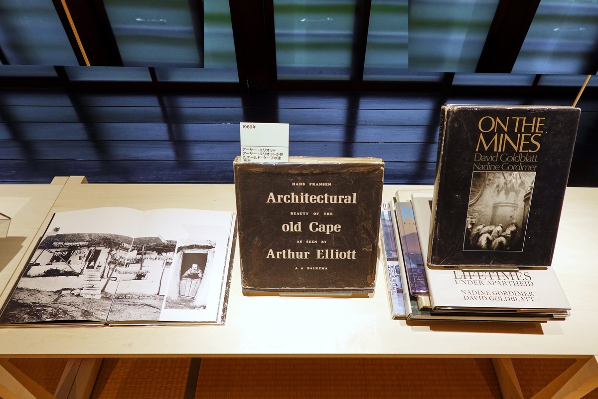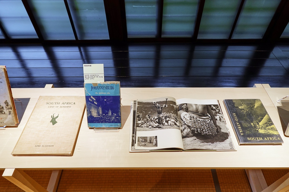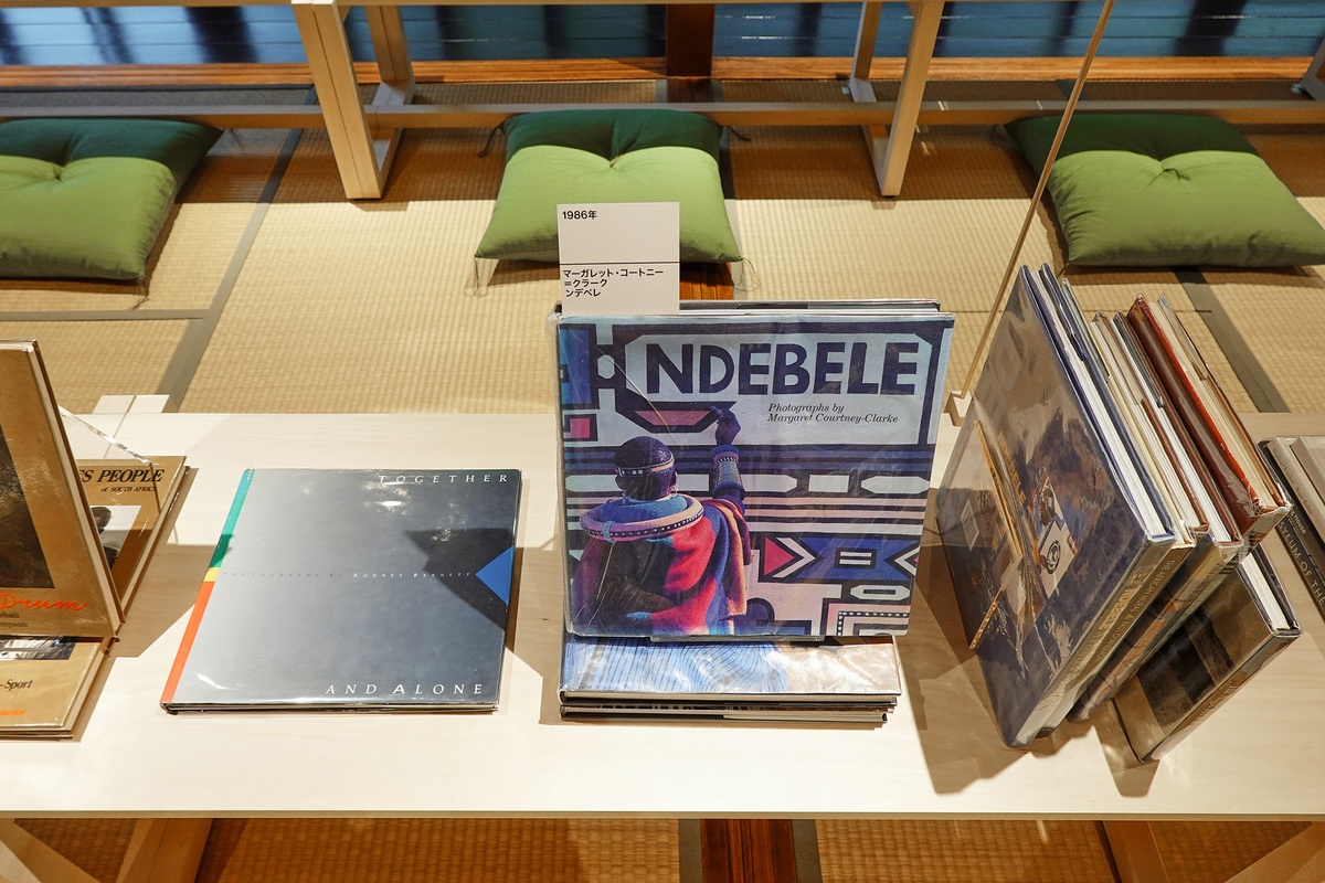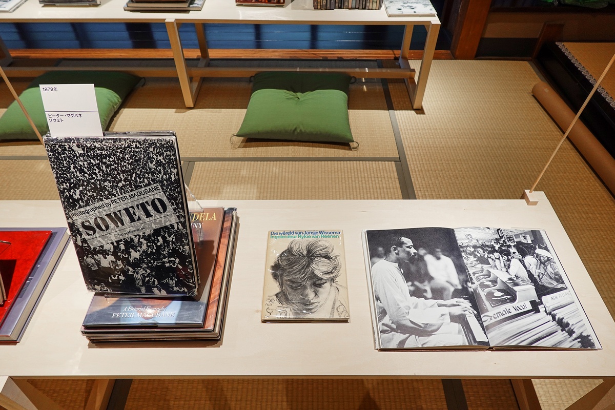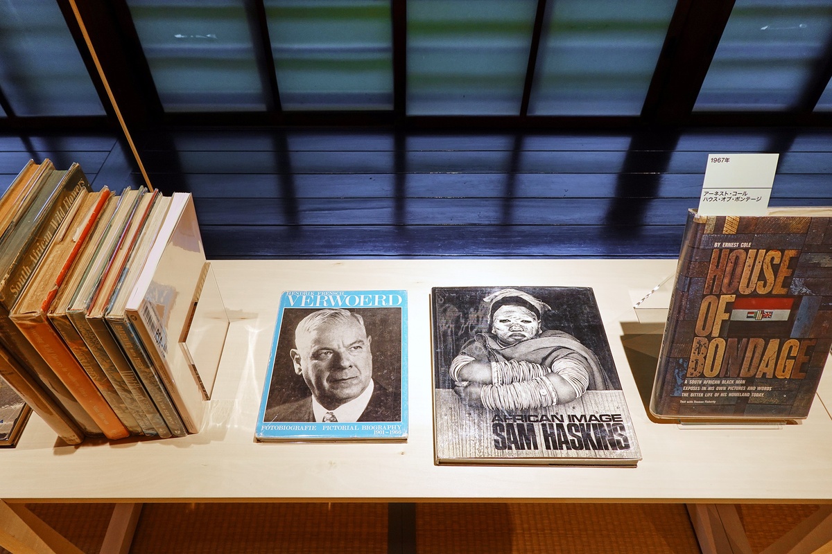 京都の八竹庵(旧川崎家住宅)2階での展示も同様に時系列にそった配置ですが、ここでは3つのテーブルを展示台として使用しています。これは、国家による弾圧と検閲が写真集をも巻き込み、政治的緊張に包まれたアパルトヘイト政策下(1948-1994年)において、いかに現代的な写真集の出版文化が南アフリカで芽生えたかを示しています。また、民主化後(1994年から現在)のセクションでは、写真表現やブックデザインにおける革新的な取り組みの事例も数多く紹介されています。