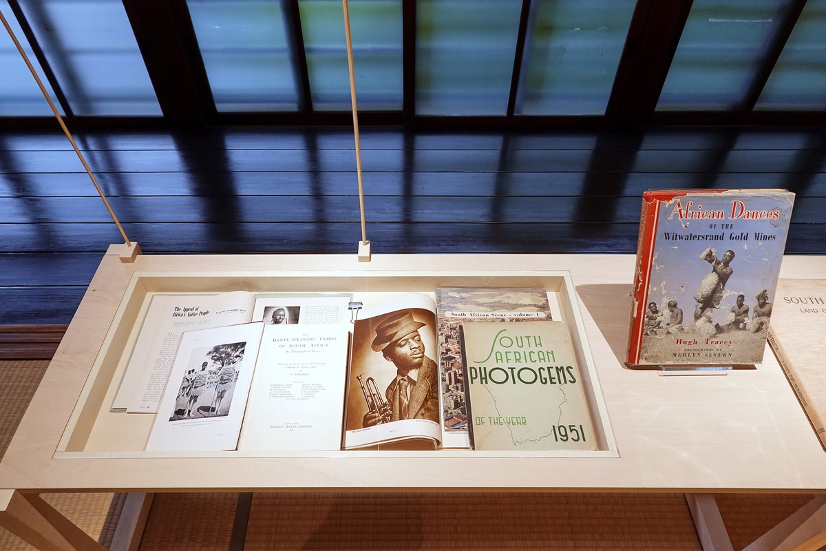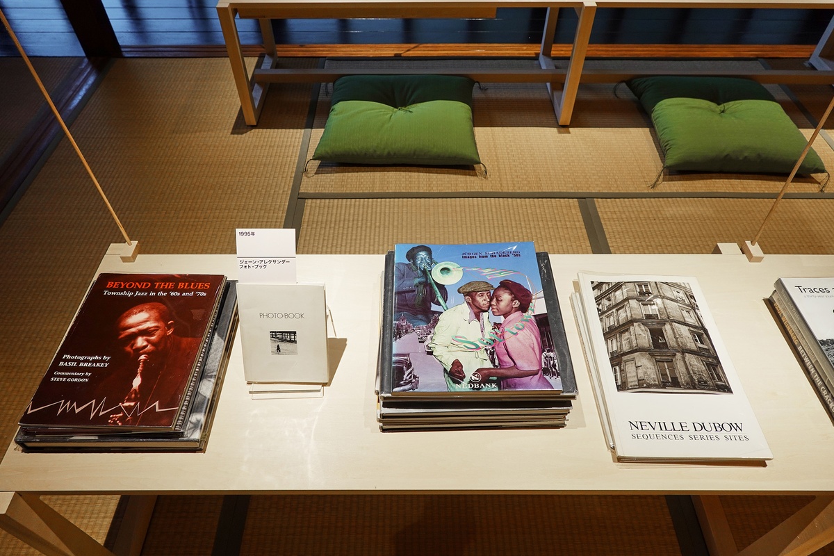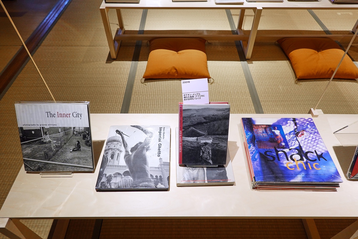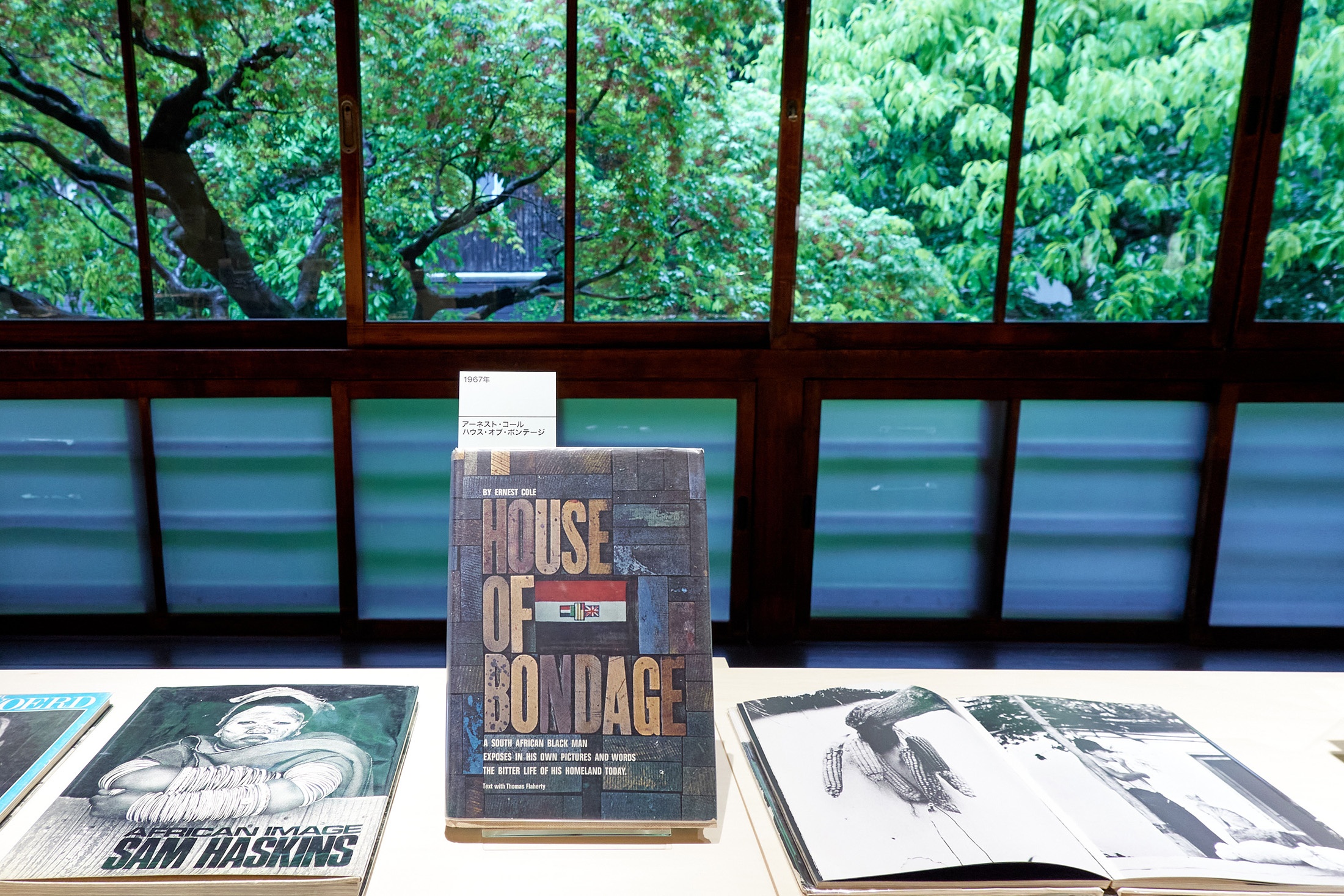 京都の八竹庵(旧川崎家住宅)2階での展示も同様に時系列にそった配置ですが、ここでは3つのテーブルを展示台として使用しています。これは、国家による弾圧と検閲が写真集をも巻き込み、政治的緊張に包まれたアパルトヘイト政策下(1948-1994年)において、いかに現代的な写真集の出版文化が南アフリカで芽生えたかを示しています。また、民主化後(1994年から現在)のセクションでは、写真表現やブックデザインにおける革新的な取り組みの事例も数多く紹介されています。