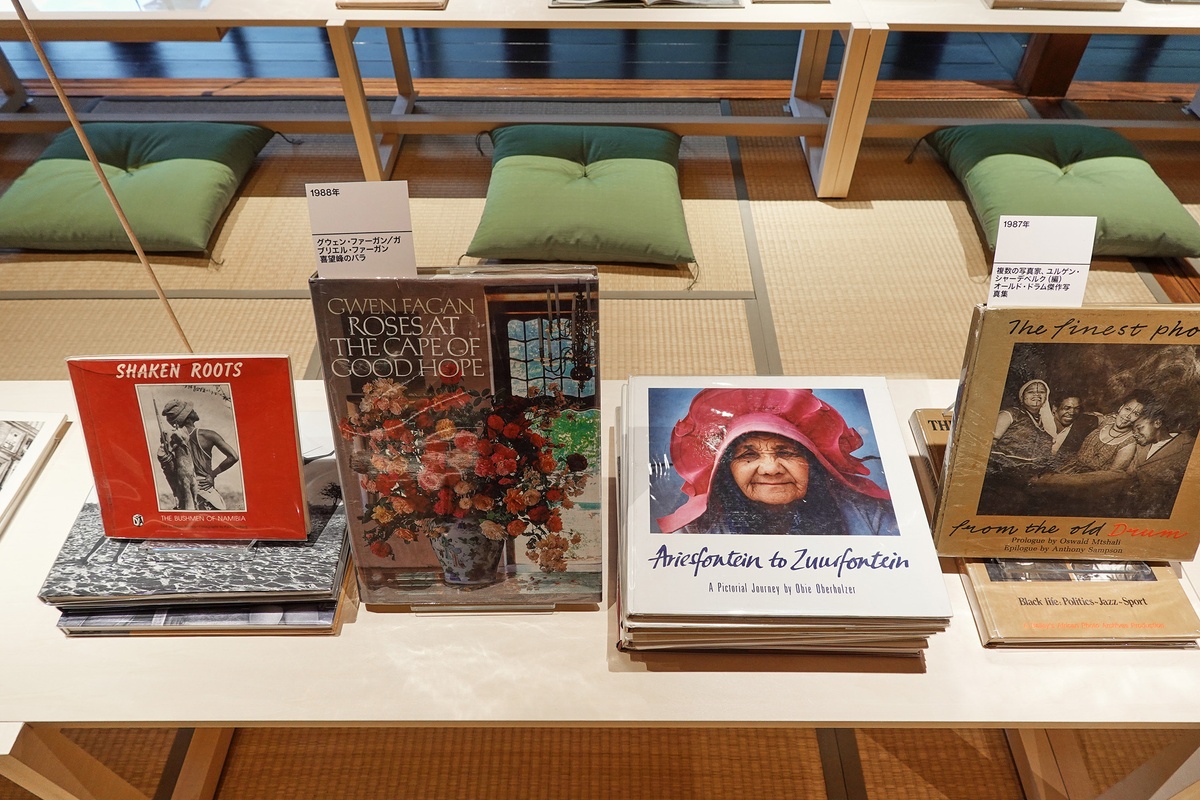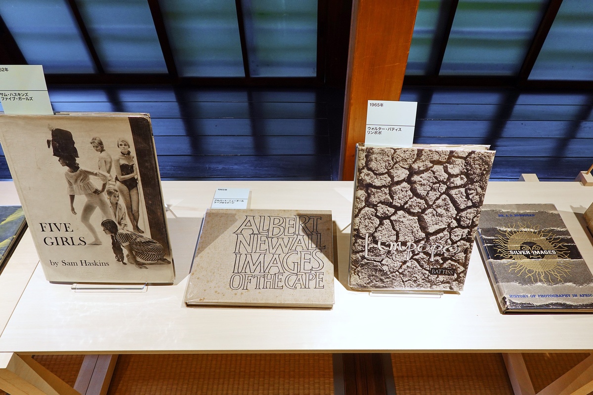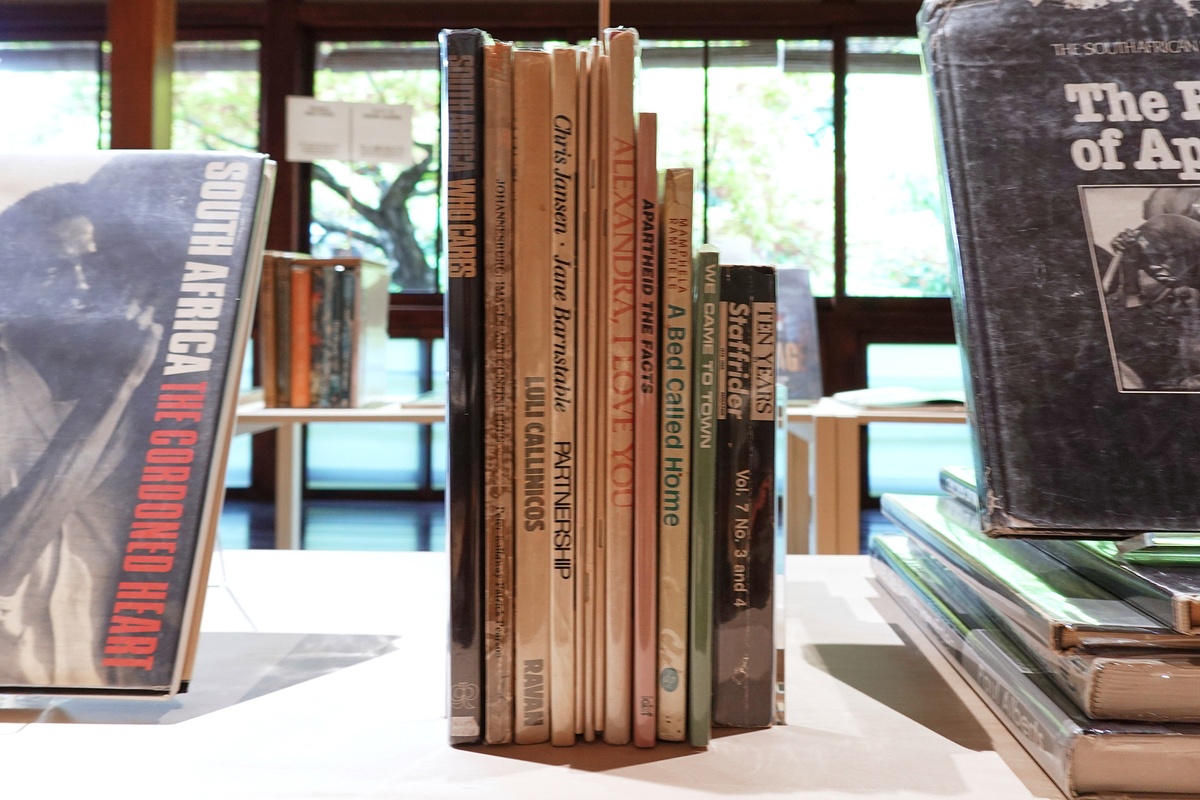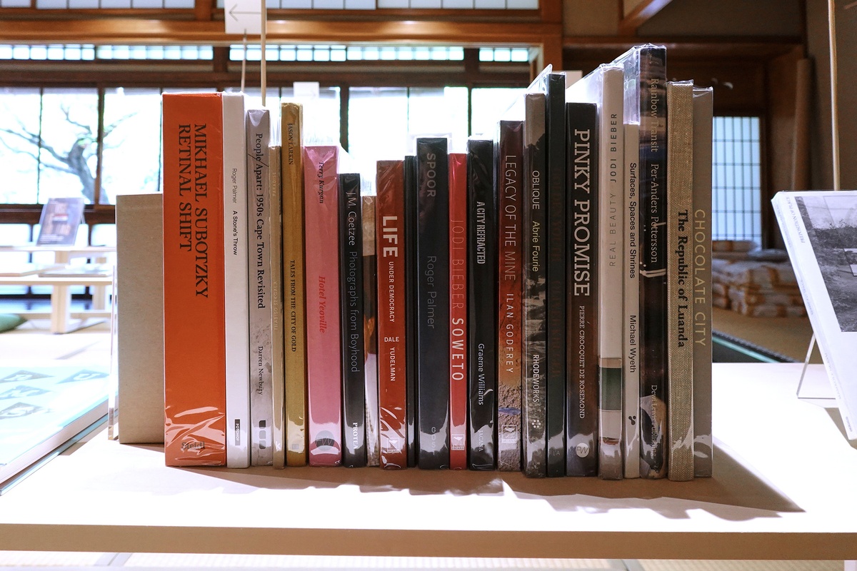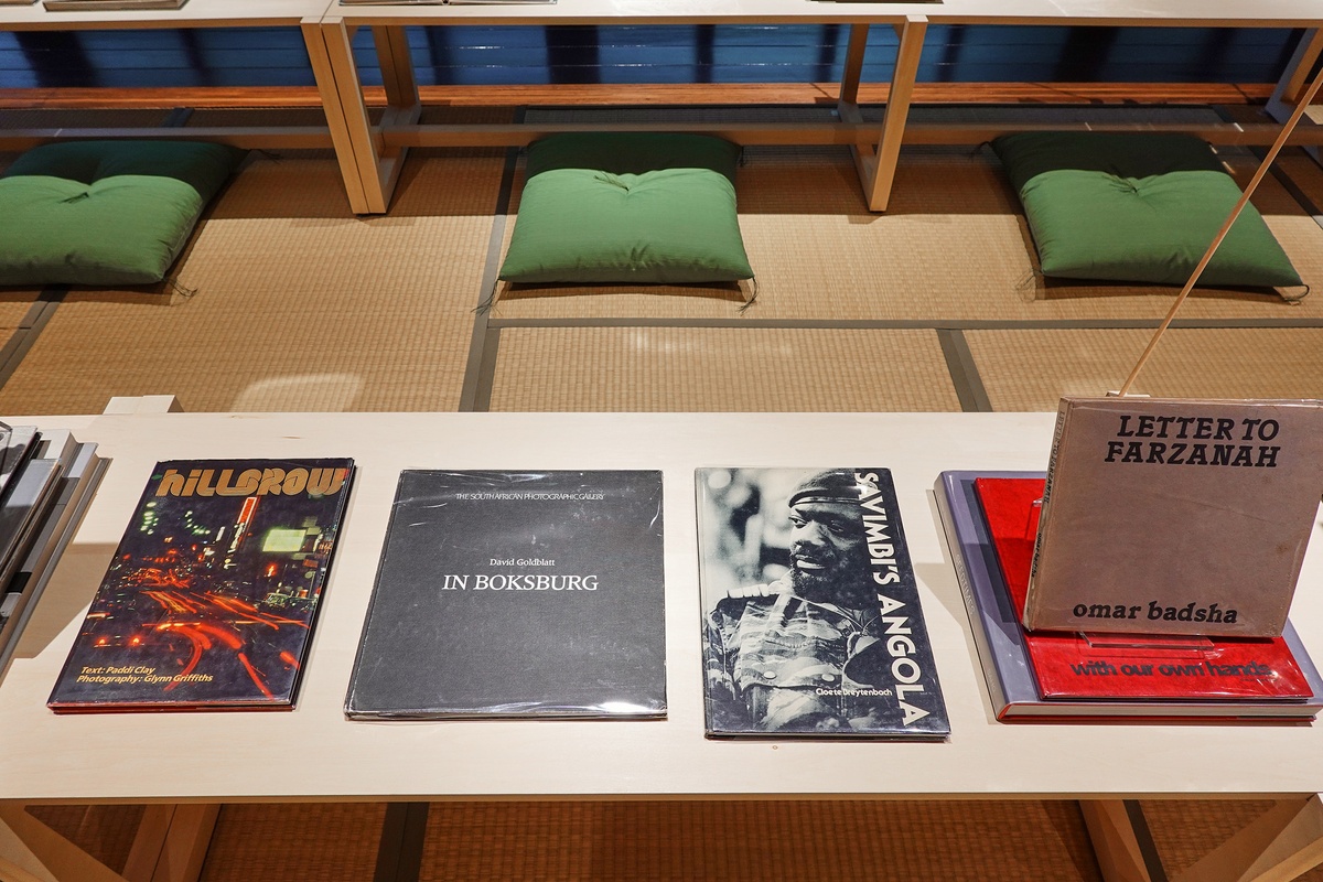 The books here on the first floor of Kyoto’s Hachiku-an (former Kawasaki residence) are also chronologically displayed in a timeline, albeit across three tables. This timeline presents evidence of the beginnings of a cosmopolitan book culture during the politically charged years of high apartheid years (1948–94), when state repression and censorship ensnared even photobooks. It also includes abundant examples of innovation in photography and book design in the democratic years that followed (1994–present).