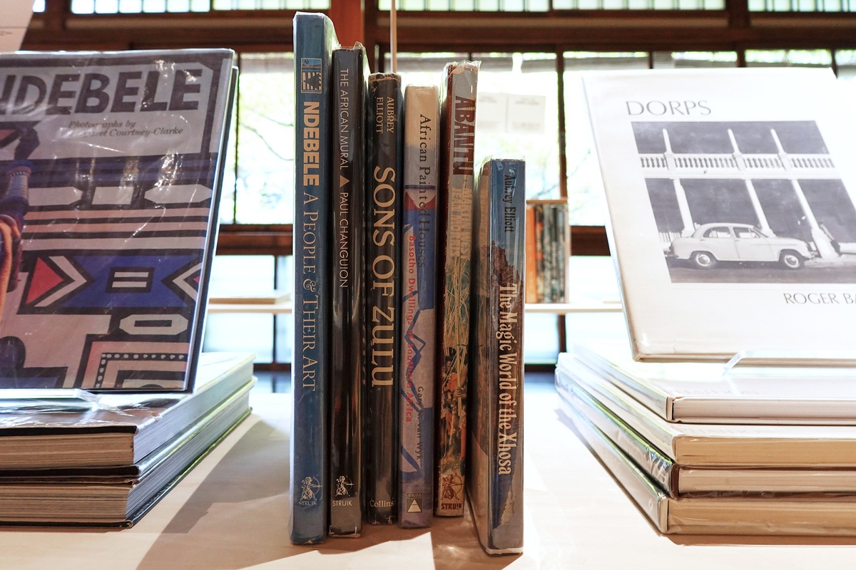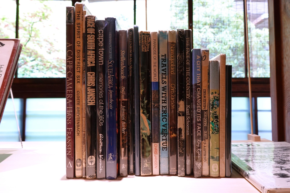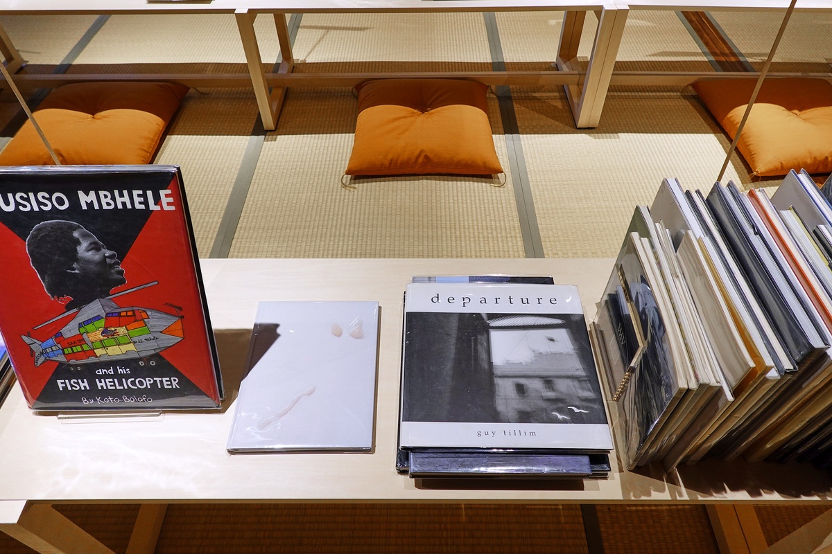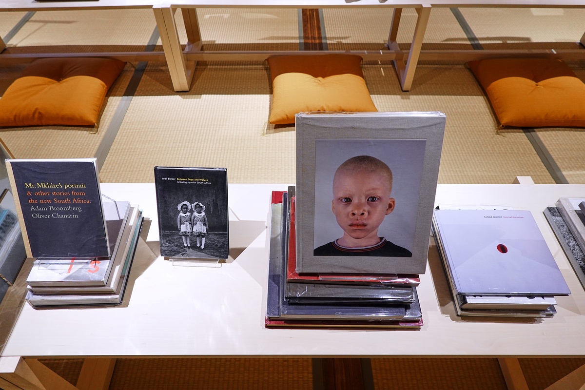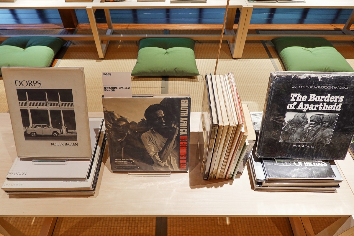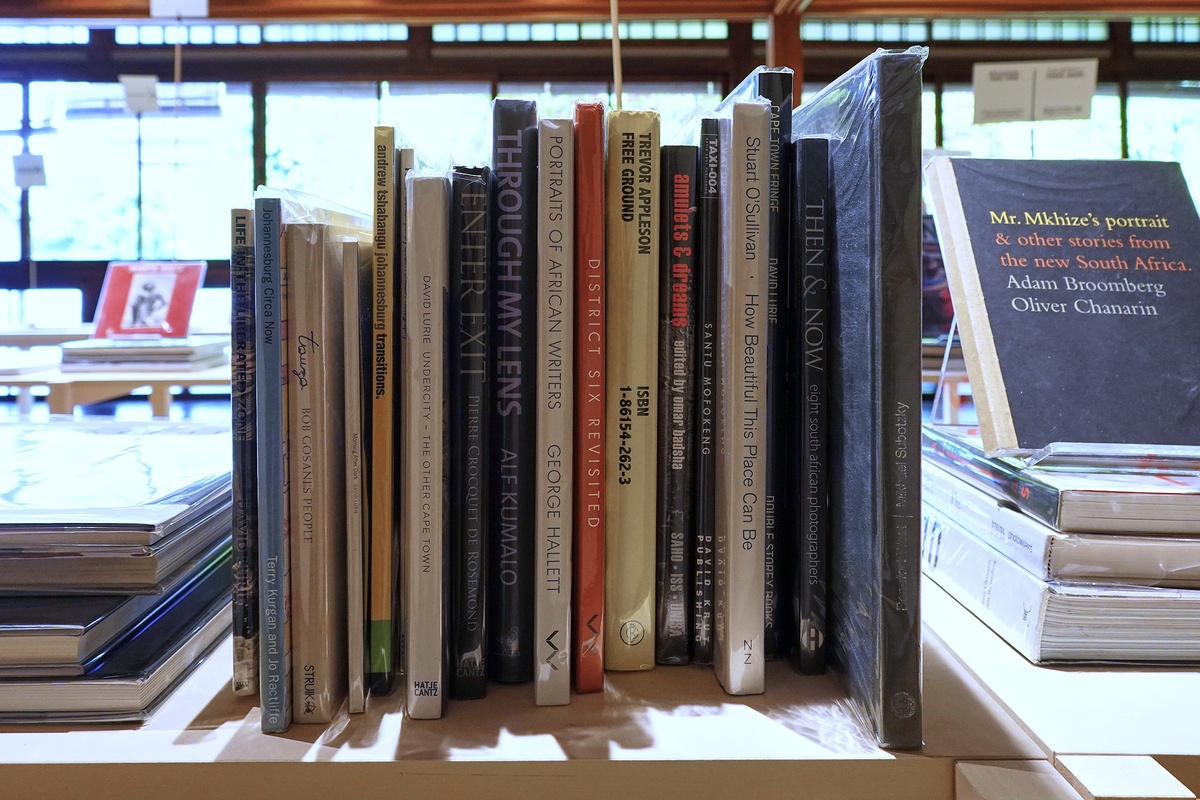 The books here on the first floor of Kyoto’s Hachiku-an (former Kawasaki residence) are also chronologically displayed in a timeline, albeit across three tables. This timeline presents evidence of the beginnings of a cosmopolitan book culture during the politically charged years of high apartheid years (1948–94), when state repression and censorship ensnared even photobooks. It also includes abundant examples of innovation in photography and book design in the democratic years that followed (1994–present).