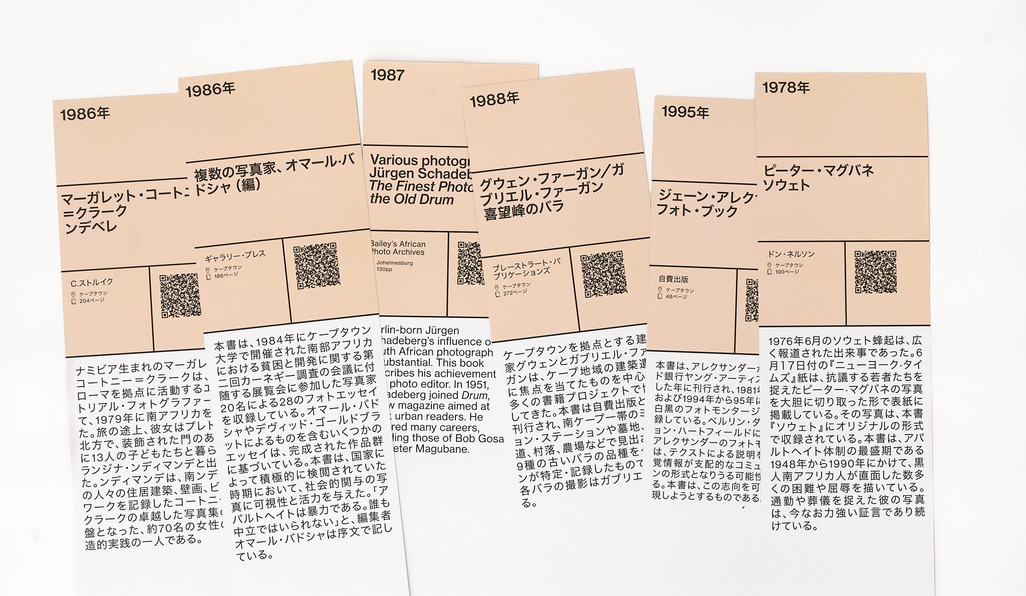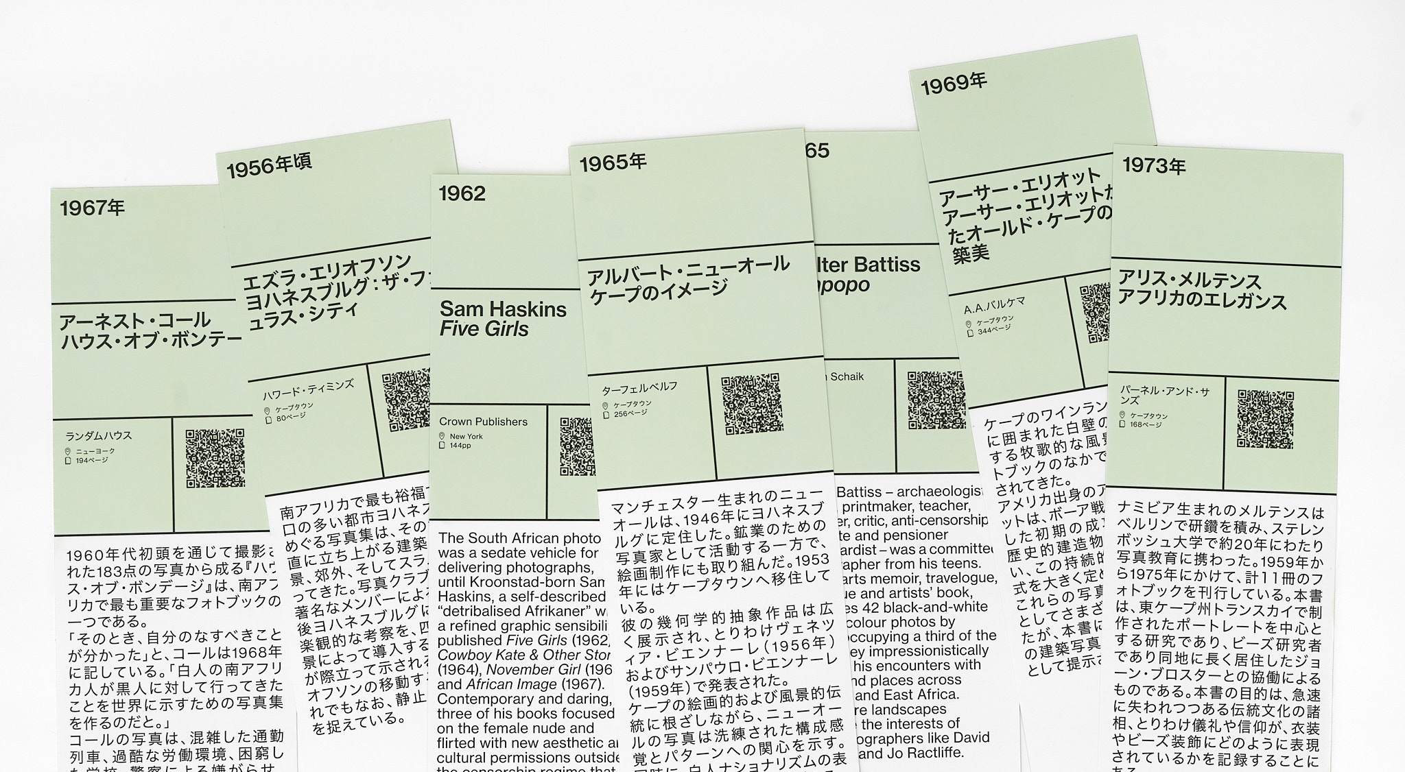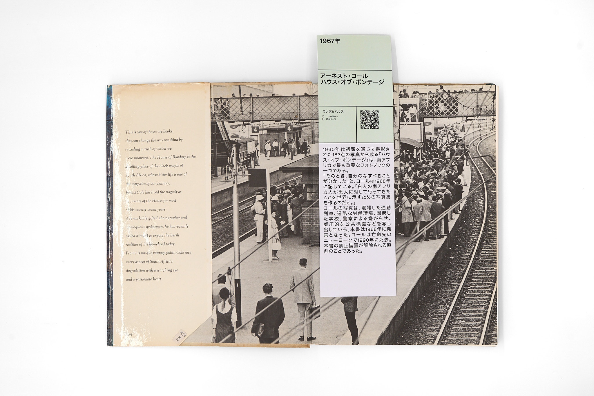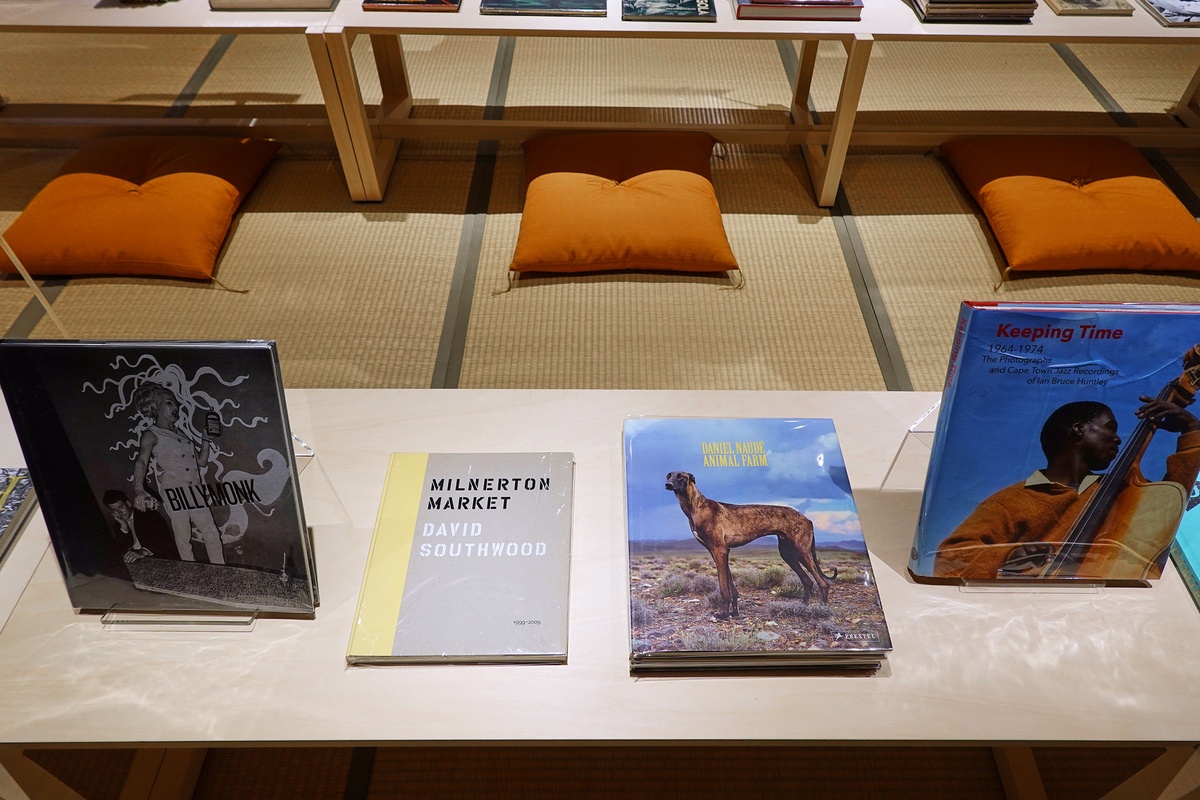 The books here on the first floor of Kyoto’s Hachiku-an (former Kawasaki residence) are also chronologically displayed in a timeline, albeit across three tables. This timeline presents evidence of the beginnings of a cosmopolitan book culture during the politically charged years of high apartheid years (1948–94), when state repression and censorship ensnared even photobooks. It also includes abundant examples of innovation in photography and book design in the democratic years that followed (1994–present).