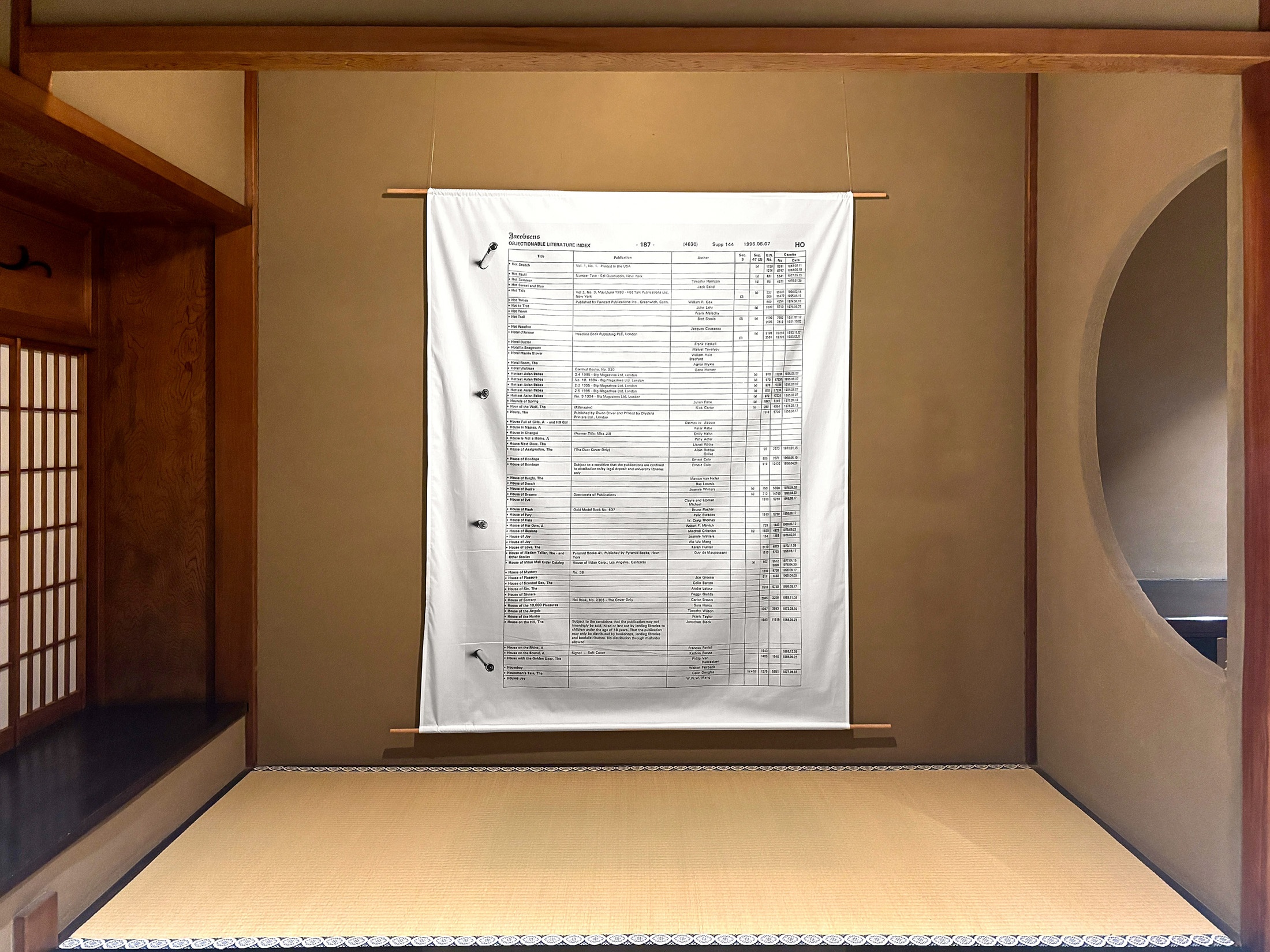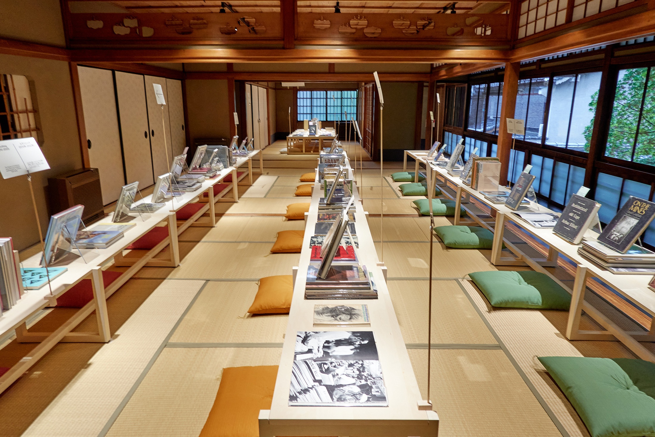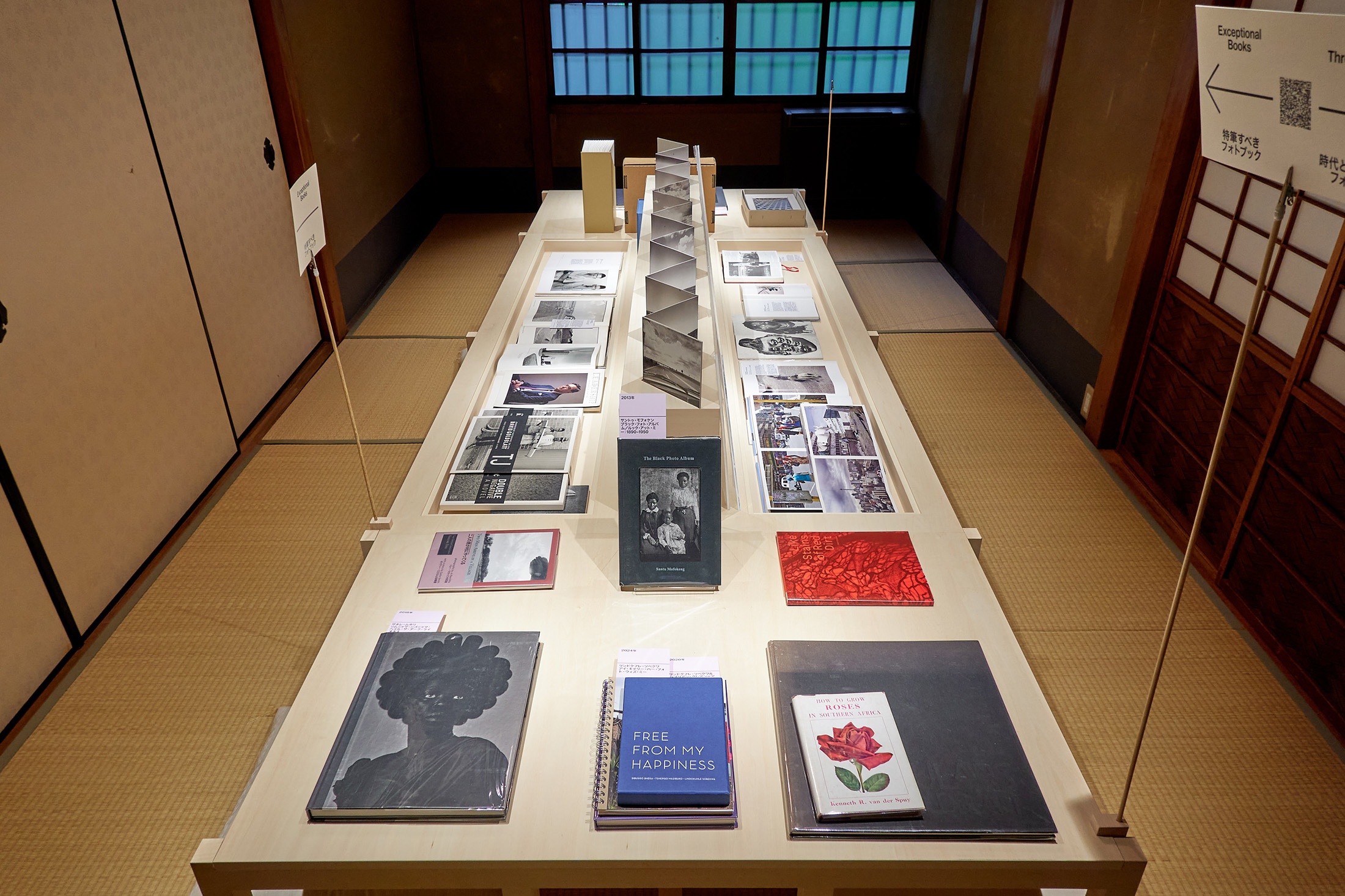 本展の展示構成(シノグラフィー)は、二つのキュラトリアルな選択を中心に組み立てられている。すなわち、1945年から2025年までのフォトブックのコレクションを年代順に展示すること、そしてその大半を実際に手に取って閲覧できるようにすることである。「タイムラインは、複雑な物語を語るための有効な方法として、これまでにも実証されてきた概念的装置です」と、この構成についてショーン・オトゥー ルは語る。「本は装飾的なオブジェではありません。触れられ、その中のアイデアと向き合われるべきものなのです。」このタイムラインは、 2022年に南アフリカのA4 Arts Foundationで初めて発表され、ギ ャラリーの全長にわたる長い棚として構成されていた。KYOTOGRAPHIEでは、この基本構造を京都・八竹庵(旧川崎家住宅)の空間構造に合 わせて慎重に再構成し、三つの低く長いテーブルとして展開している。これにより、来場者は座った姿勢でフォトブックと親密に向き合うことができる。大きな窓と縁側に面して本を読むことができるため、自然光が空間全体をやわらかく照らす。隣接する小さな部屋では、希少な出版物や複数巻から成る書籍を厳選して紹介する。