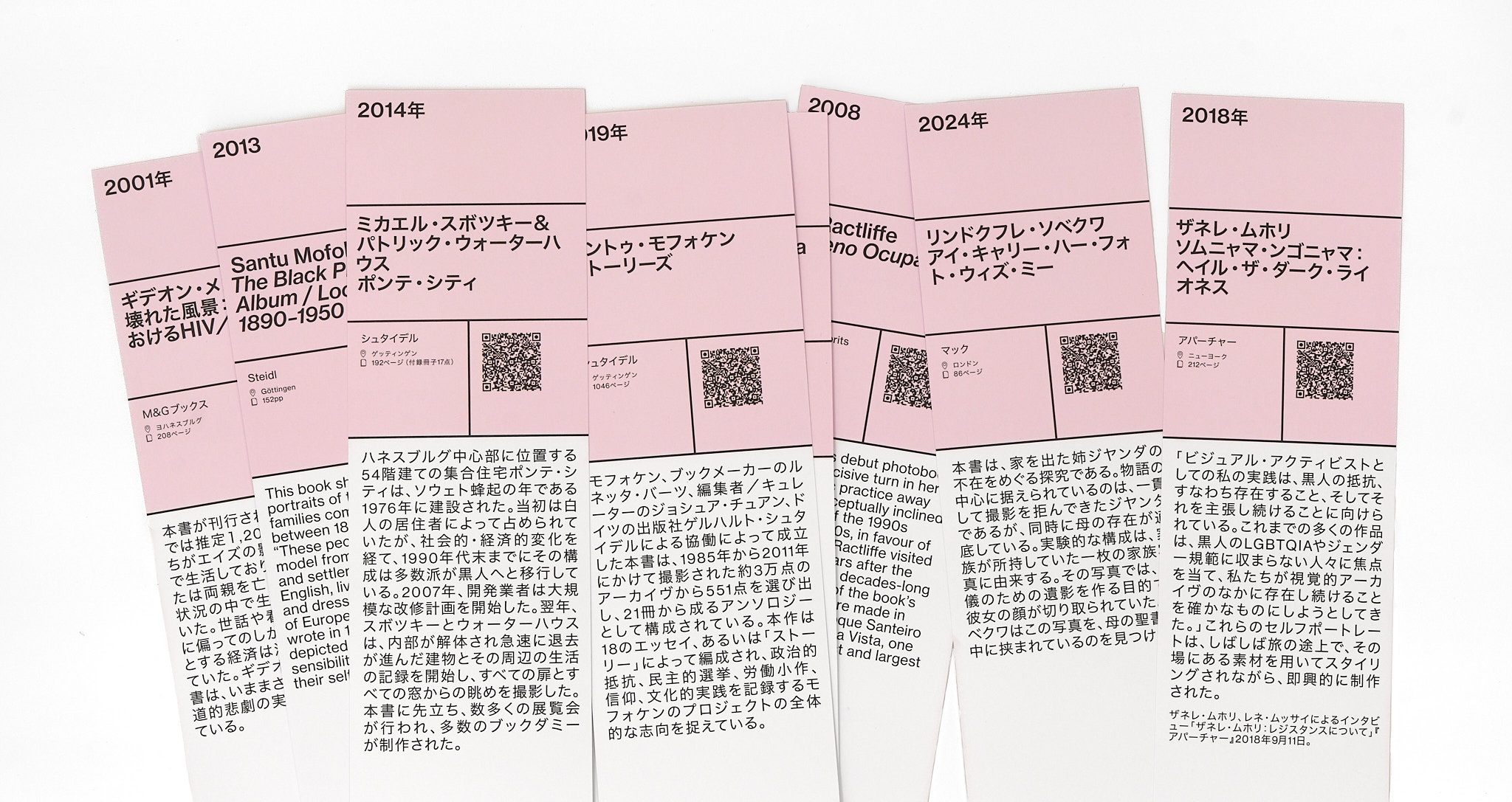 「手に取れる」ということこそが、この展覧会の主なコンセプトです。本は飾るためのものではありません。手に取って、その内容と向き合うべきものなのです。2022年にケープタウンのA4 Arts Foundationで開催された「Photo book! Photo-book! Photobook!」では、ギャラリーの内周にぐるりと設置された棚に写真集を時系列で並べて展示していました。こうした展示方法は、複雑な歴史のストーリーを伝えるうえで有効な手法として確立されています。