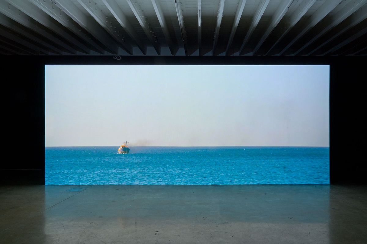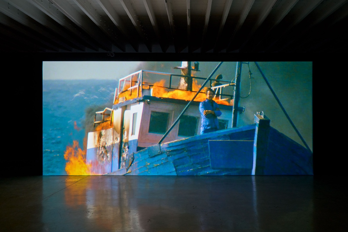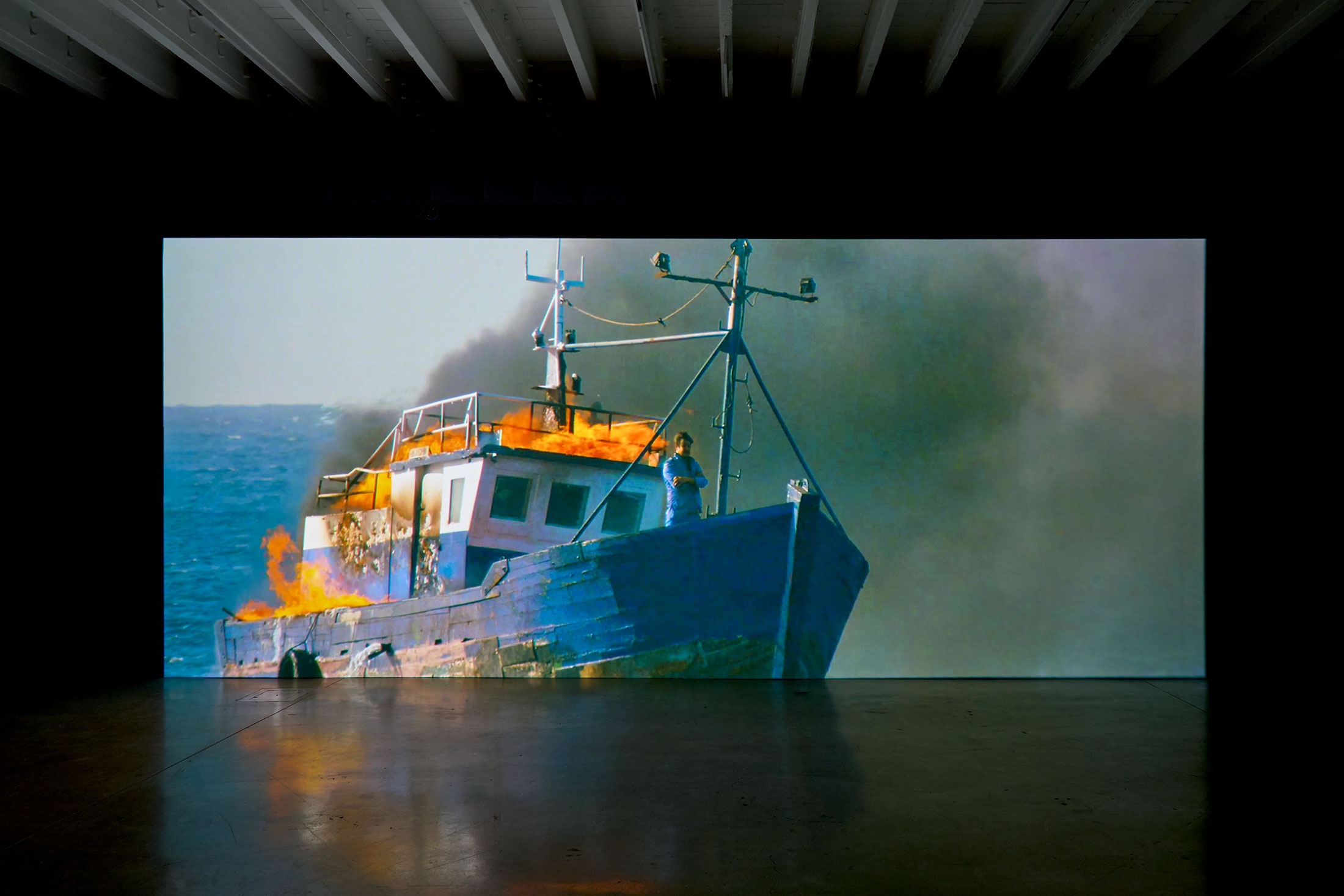 Jam Proximus Ardet, la dernière vidéo (2021) follows on from Adel Abdessemed appearing to set himself alight in the street below his Paris studio in Je Suis Innocent (2012). He refers to himself as “an artist who gets fired up all the time. It’s my drive, really. It is a hot, burning fire. Just like the current world news.” The film witnesses a burning boat at sea. The artist comes into view standing stoically at the bow, arms crossed, gaze fixed, his posture imperturbable considering the blaze at his back. The title is taken from a line in Virgil’s Aeneid (29–19 BC) warning that the house of Ucalegon, an elder of Troy, is on fire. The alert that the neighbour’s house is already alight implies that if they burn, we burn along with them. “Dante chose Virgil, a poet, as the guide into the Underworld,” he says of the philosopher’s decision when writing his Divine Comedy between 1308–1320, to place the ancient Roman poet in Limbo, and have him called on to guide the author through Hell. Abdessemed again calls on Virgil in this title as witness to the hell inflicted on migrants. “When I say crossing I also mean beyond. Going towards something unknown. The boat is really about crossing, not from one horizon to another but from one beyond to another.” Whether the poet in this work brings the fiery reckoning or simply warns us of its coming remains ambiguous.
