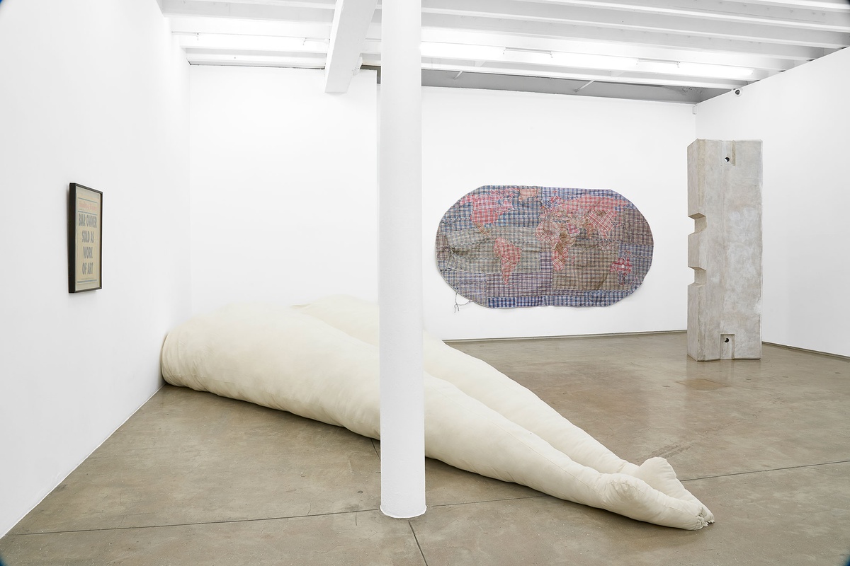Cartography sits on an axis of pictorial representation and geometric abstraction. For Dan Halter, who brings the ‘red-white-blue’ bag into the dialogue, the map has been a tool to talk about migration, national identity and geopolitical power. Its fabric was originally invented as a tarp for construction sites, agricultural structures and temporary shelter in Japan. It was first transformed into a light-weight tote in the 1960s by a tailor in Hong Kong, but quickly became synonymous with the aesthetic language of border-crossing. In Nigeria, the bag is known as the ‘Ghana Must Go bag’, in South Africa, the ‘Zimbabwe bag’, in Germany, ‘Tuekenkoffer’ (Turkish suitcase), and in Guyana, the ‘Guyanese Samsonite’ – each name referencing complex geopolitical situations in each location.