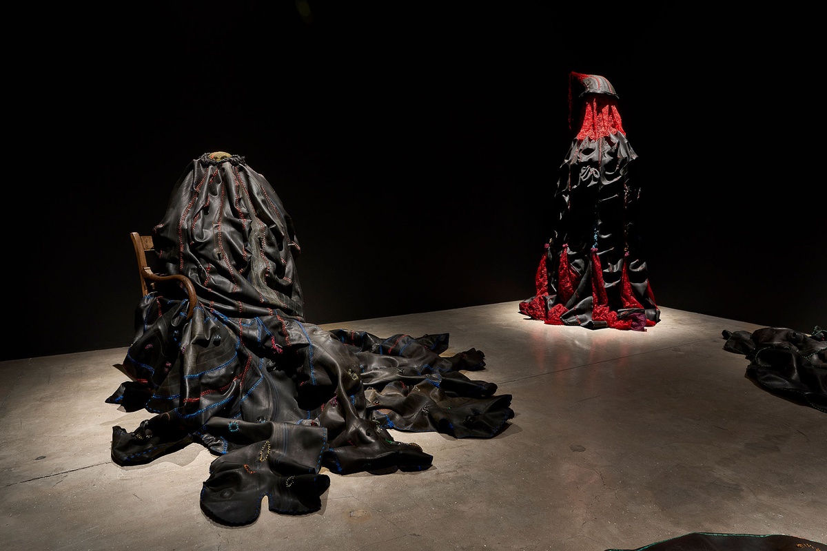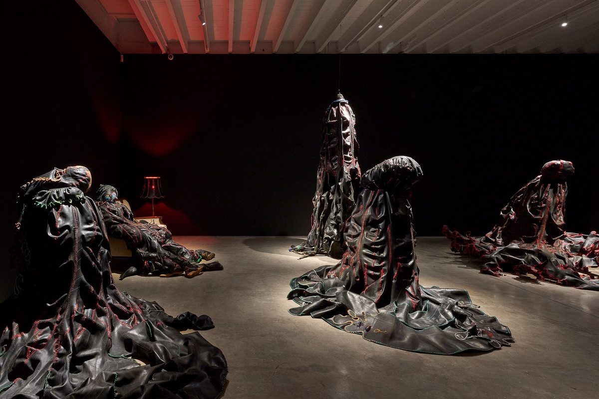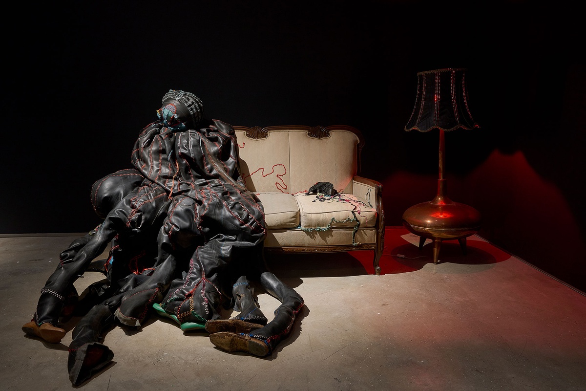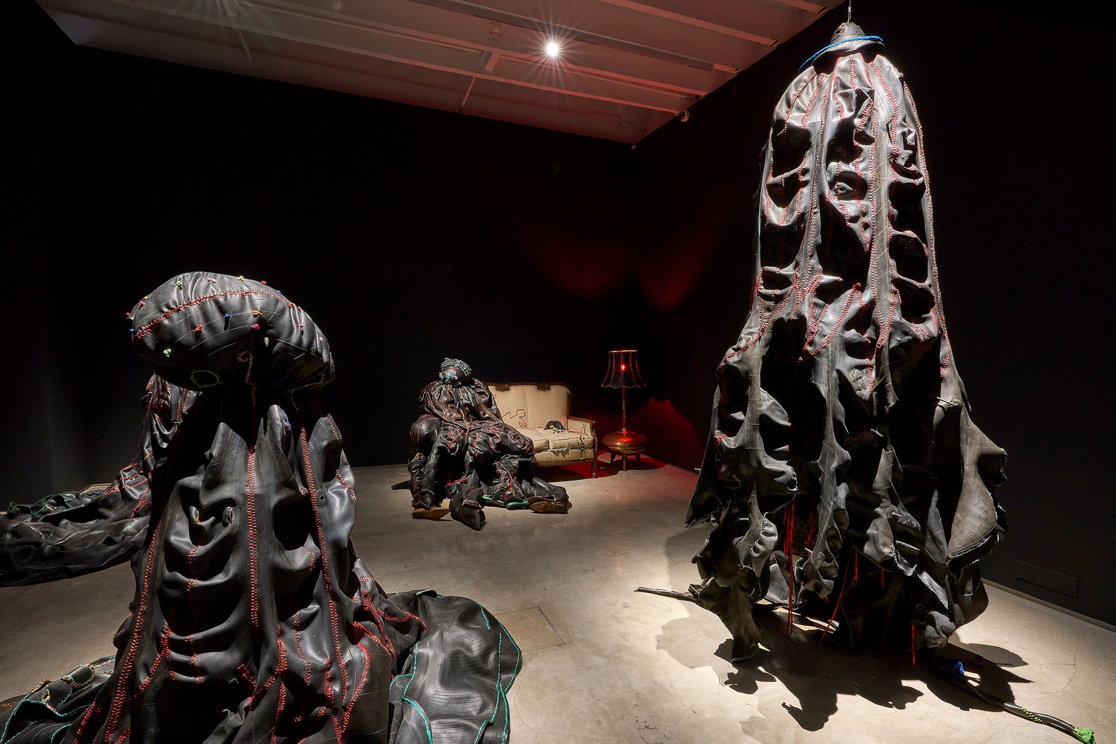 Izithunzi (trans. The Shadows), the artwork that earned Hlobo the 2009 Standard Bank Young Artist Award for Visual Art, stages eight amorphous figures performing a theatrical reimagining of umtshotsho, a traditional Xhosa coming-of-age party that allows for youthful curiosities about adulthood to be explored. Hlobo weaves desire, transformation, and sexuality into this moment of suspended performance: bodily innuendos frozen in gesture and the music stilled. Satin ribbons sewn into the dark exoskeletons of these ‘shadows’ are allusive of queer adornment. Using these ribbons to stitch together rubber sheaths, Hlobo seeks to reconcile his cultural belonging with his sexual identity. The seam becomes both a bridge and a border – simultaneously the site of separation and connection. The phallic, bulbous figures masquerade through the party, feigning knowledge while still trying to learn. A mask that clings to the couch alongside a slouched figure has its eyeholes sewn shut – a reminder that the performance of confidence, the pretence of knowing, can be blinding. “I am looking for the source of the shadow,” Hlobo says, “but it keeps moving. The thing is moving away and I am chasing it.” These words echo through Izithunzi, as the work lingers in the pursuit of the shifting edges of self.